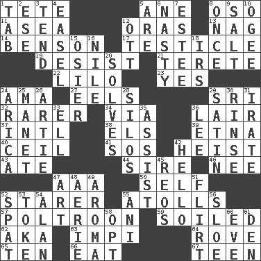 ACROSS 1. False hair 5. A saturated hydrocarbon 8. Bear (Spanish) 11. Toward the sea 12. Mouths or openings 13. Tired old horse 14. Gillaume's butler role 17. A testis 19. Stop 21. Cylindrical with tapered ends 22. _ and Stitch 23. It is so 24. Wet nurse (var.) 27. Snakelike fish 29. Indian title of respect (Mr.) 32. More valued for its uncommonness 34. By way of 36. Den 37. International (abbr.) 38. Raised railways 39. Inactive volcano in Sicily 40. To provide with a ceiling 41. Mayday 42. Robbery 43. Had dinner 44. Father 46. Born 47. Auto club (abbr.) 50. Itself 52. A viewer who gazes fixedly 55. Ringlike coral islands and reefs 57. Characterized by complete cowardliness 59. Dirtied 62. Alias (abbr.) 63. Body of Kaffir warriors 64. Be footloose 65. Nine, plus one 66. Consume 67. Adolescent DOWN 1. Bar bill 2. Compass dir. 3. Look after 4. Artist's stand 5. "We ___ not amused" (Victoria) 6. Offensive 7. First name in cosmetics 8. At one time in the past 9. Table seasoning 10. Double curve, resembling the letter S 12. Baseball player Mel 15. Flexible twig of a willow tree 16. The longest river in the world 18. Big collection agency 20. Finds the solution 24. N. Chile seaport 25. French painter Edouard 26. Nick name for Arthur 28. Grain storage towers 29. Smooth fabric 30. Wash lightly 31. Feeling or showing extreme anger 33. Pipe bend 35. Help 36. Area sheltered from the wind 42. Phone greeting 45. Vintage cars 47. Tate display 48. Nest on high 49. Scent 51. Talk or behave amorously 52. Petty quarrel 53. Casino tip 54. Actor Alda or Thicke 55. Black tropical American cuckoo 56. _ gin 58. Choose 60. Night before a holiday 61. Lair