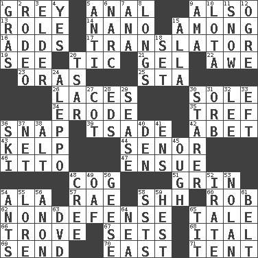 ACROSS 1. Jennifer or Joel 5. Of or related to the anus 9. In addition 13. Hero or heavy, e.g. 14. Billionth: prefix 15. Amid 16. Sums up 17. Interpreter 19. Perceive with the eye 20. Nervous spasm 21. Set 22. Deep reverence 23. Mouths or openings 25. R.R. building 26. Shoestrings 30. Flatfish 34. Wear away 35. Unclean, religiously 36. Fastener 39. Sadhe (variant) 42. Collude with 43. Seaweed 44. Sir (Sp.) 46. "Tell ____ the Marines!" 47. Follow as a consequence or result 48. Gear tooth 51. Broad smile 54. Insect wing 57. Actress Charlotte 58. Quiet! 60. Director Reiner 62. Unrelated to defense, as in spending 65. Falsehood 66. Collection of objects 67. Arranges properly for use 68. Slanted text style (abbr.) 69. Transmit 70. Compass direction 71. Portable shelter DOWN 1. Pate de foie ____ 2. Cowboy competition 3. A person who is older than you are 4. Affirmative reply 5. Opposed to 6. Drug cop 7. Santa ___, CA 8. Yearns 9. Nursemaid (var.) 10. Globular water bottle used in Asia 11. Frozen precipitation 12. Legendary monster 15. Silent film actress Nazimova 18. Arrange properly for use 20. Russian ruler of old 24. City in Syria 27. Small bed 28. Begley and Asner 29. Gospel singer Marvin 30. A viewer who gazes fixedly 31. Globe 32. Area sheltered from the wind 33. Bank Draft (abbr.) 36. What Jean-Claude Killy likes to do 37. Fish or hair follower 38. The first octave above the treble staff 40. Lair 41. Followers of ems 45. Ending for "Through" and "Enough" 48. Algonquian 49. Clumsy lout 50. Honkers 52. Feeling or showing extreme anger 53. Pitcher Ryan 54. Pismires 55. Old wives' tales, e.g. 56. At once, immediately (arch.) 58. Fast planes 59. Behest 61. Waist strap 63. Movie disc 64. Teachers' org. 65. Teat (slang)
