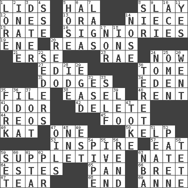 ACROSS 1. Flaplike coverings 5. Actor Linden 8. Kill 12. Washington bills 13. Mouth or opening 14. Sibling's daughter 15. Assign a rank or rating to 16. Seigniories (variant) 19. Compass dir. 20. Thinks logically 21. Celtic language 23. Actress Charlotte 24. Immediately 27. Singer Brickell 30. Heavy book 31. Evades 34. Genesis locale 35. Do some clerical work 38. Artist's stand 40. Monthly bill 41. Aroma 42. Keyboard key 44. Vintage cars 45. 12 inches 46. Krazy ___ of comics 47. Single 50. Seaweed 53. Heighten or intensify 57. Ingest 59. Supplementary 63. Nathan's nickname 64. _____ Park, CO 65. Baking dish 66. Cy Young winner Saberhagen 67. Rend 68. Conclusion 69. Queen of England 1702-14 DOWN 1. Old wives' tales, e.g. 2. Empty; void 3. Prevent from occurring 4. Compass dir. 5. Stockings 6. Roberta Peters solo 7. Falls behind 8. Title for a knight 9. Luau accessory 10. Adept person 11. Consenting reply 14. Olfactory organ 17. Not either 18. _ tizzy (2 wds.) 20. Do over again 22. Spring feasts 24. Connecting point 25. Sign of something about to happen 26. Left 28. Binary compound 29. Mild oath 30. Cylindrical with tapered ends 32. Compass dir. 33. Automatic 35. Tined utensil 36. The content of cognition 37. Plunder 39. Lion 43. Puff or smoke 47. Lubricates 48. Compass dir. 49. Eastern Standard Time (abbr.) 51. Acquire or gain knowledge or skills 52. Eucharist need 54. Corncob 55. _ the terrible 56. Tear apart 58. False hair 59. Arrange properly for use 60. Purpose 61. Parent Teacher Assoc. 62. For each 63. Basketball assoc.