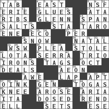 ACROSS 1. Bar bill 4. Compass direction 8. Science/research agcy. 11. 4th largest of the Great Lakes 13. Cements 15. _ moment's notice (2 wds.) 16. Teases 17. American astronaut and politician John 18. Connect, as a bridge 19. Table seasonings 21. R.R. building 22. Pacific island yam 23. Compass dir. 24. Environmental prefix 27. For each 29. Overwhelm 30. Relating to or accompanying birth 34. Compass dir. 36. Entreaty 39. Took without asking 40. Globular water bottle used in Asia 41. Spanish missionary in California 43. Musical group of three 44. Metal shackles 46. Labels 47. Sep. follower 48. Allots cards 49. A really long time 51. Deep reverence 53. Pet locale 54. Fitting 57. Pig sound 60. Commissioned mil. rank 63. Ancient Roman robes 65. Leg joint 66. Came up 69. Roberta Peters solo 70. Call ___ day 71. Administered medicine 72. Tear apart 73. Pipe bend 74. Arranges properly for use 75. Compass dir. DOWN 1. Laconic 2. Believer in; advocate of (suffix) 3. God's Word 4. Ovum 5. 100% 6. Takes to court 7. Portable shelter 8. California wine valley 9. Play the lead 10. Papal veil 12. Eastern Standard Time (abbr.) 14. Fastener 18. Ski resort town in Vermont 20. Elected rep. 25. 911 reaches them 26. A small or young owl 28. Followers of ems 29. Tchaikovsky ballet 31. Torque (variant) 32. Set down 33. Lion 34. Had on 35. Portico 37. Period 38. Therefore, facetiously 40. Hat (slang) 42. Toward the sea 45. Compass dir. 50. Choose 52. Mild oath 54. Match 55. Aches 56. Sadhe (variant) 57. Migrant worker of the '30s 58. International (abbr.) 59. Anneal 61. Greek god of love 62. Sense of smell 64. Rowing implement 67. Arrange properly for use 68. Begley and Asner