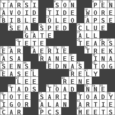 ACROSS 1. Tarsus (plural) 6. Manchild 9. Animal enclosure 12. Keep away from 13. Periodic rise and fall of the sea level 14. Had on 15. Instruction Manual for Humans 16. Butter sub 17. Domed church section 18. Ocean 19. Broke a traffic law 20. A slight indication 21. Yard entry 23. 100% 24. False hair 25. Pulls into pieces 28. Ewer handle 30. Nest on high 34. Long journey 35. White ___ sheet 36. Indian princess (variant) 38. _ tizzy (2 wds.) 39. Elected reps. 41. Ferber et al. 43. Coat; cloak 44. Artist's stand 46. Trust 48. Area sheltered from the wind 49. French philosopher Descartes 50. Bits 51. Frog relative 53. Compass dir. 56. Lug 57. Indian skirt 58. Sycophant 60. Composer Stravinsky 61. Actor Alda or Thicke 62. Nick name for Arthur 63. Automobile 64. Personal Computers (abbr.) 65. Confronts DOWN 1. Bar bill 2. Opinion 3. Loose flowing garment 4. Fodder prepared in a silo 5. Binary compound 6. Filth; sediment 7. Wrote a lyric poem 8. Modern: prefix 9. Teen's desire 10. Celtic language 11. Born 13. Drink excessively 14. Place for singles 19. Navigate 20. Feline 22. "One Day ___ Time" 24. Interpreter 26. Former U.S. Attorney General Janet 27. Heroin 28. Comfort 29. At sea 31. Actress Charlotte 32. Working for oneself (abbr.) 33. Car or cant ending 37. Having ears or earlike features 40. Sowing specialist 42. Elected rep. 45. French article 47. Poe poem 49. Water falling in drops from the sky 50. Ancient Roman robe 51. Baby powder 52. Mouths or openings 54. Nathan's nickname 55. Prepare for publication 56. Nervous spasm 57. Plant excrement 58. Scottish cap 59. Affirmative reply