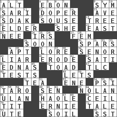 ACROSS 1. The first octave above the treble staff 4. Inky black, to poets 8. Symbol (abbr.) 11. Indian skirt 13. Drug addict 15. "___ Maria" 16. Neighbor of Neb. 17. Lush 18. Family _ (genealogy) 19. A person who is older than you are 21. A female animal or person 22. Compass direction 23. Born 24. Big collection agency 27. Opposite of masc. 29. Within a short period 30. Practice fights 34. Fitting 36. Old wives' tales, e.g. 39. Sir (Sp.) 40. One who doesn't tell the truth 41. Eat (away) 43. Suttee (variant) 44. Ferber et al. 46. Frog relative 47. Affectionate concern, for short 48. Trials 49. Allows 51. Afternoon social gathering 53. Compass dir. 54. 23rd letter of the Greek alphabet 57. Pacific island yam 60. Elected rep. 63. Pitcher Ryan 65. Uhlan (variant) 66. White Person, in Hawaii 69. To provide with a ceiling 70. Teat (slang) 71. Bert's buddy 72. Falsehood 73. Shoshoni 74. Earth 75. Fast jet (abbr.) DOWN 1. NE Netherlands city 2. Dipping utensil 3. Barter 4. Begley and Asner 5. Oct. 31 cry 6. Musical composition 7. Tender 8. "Two Mules for Sister ____" 9. Jacques Cousteau's middle name 10. Confront 12. Mamie's mate 14. Coral collection 18. Storms 20. _ de Janeiro 25. Hero or heavy, e.g. 26. Derisive sound 28. Curvy letter 29. Ski resort town in Vermont 31. Of or related to the anus 32. College mil. group 33. _ Lanka 34. Helper 35. Baking dishes 37. Friend of Pooh 38. Peak District village in England 40. Allow 42. Paradise 45. Compass dir. 50. "___ Little Indians" 52. American tennis player Robert 54. Entreaties 55. Moves on water 56. An arm off of a larger body of water 57. Ballerina skirt 58. Set down 59. Assign a rank or rating to 61. Hearing organs 62. Words to Nanette 64. Sep. follower 67. Cards in a Roman deck? 68. Snakelike fish