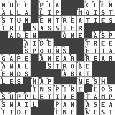 ACROSS 1. Bungle 5. Parent Teacher Association (abbr.) 8. Clement's nick name 12. Silent film actress Nazimova 13. Mouth edge 14. Damp 15. Make senseless or dizzy 16. Pleas 19. Three (prefix) 20. More lively and spirited 21. An important port of Yemen 23. Single 24. Viper 27. Assistant 30. Relationship diagram 31. Soup utensils 34. Singer James 35. Stare wonderingly 38. Approach 40. Stern 41. Of or related to the anus 42. Disco prop 44. Extremities 45. Blind as ____ 46. French article 47. Atlas unit 50. Soft 53. Motivate 57. Greek goddess of the dawn 59. Supplementary 63. Pack (down) 64. Slow-paced one 65. Baking dish 66. Toward the sea 67. Periodic rise and fall of the sea level 68. Compass dir. 69. Compass direction DOWN 1. Vertical spar for supporting sails 2. Extremist 3. Watery 4. Avid follower 5. Entreaty 6. Airtight sealed metal containers 7. Tenement units (abbr.) 8. Small bed 9. Cards in a Roman deck? 10. Compass dir. 11. Mountains (abbr.) 14. Female horse 17. _ de Janeiro 18. Car or cant ending 20. Sever or remove by pinching or nipping 22. Artist's stands 24. Johnson of "Laugh-In" 25. Bristle 26. Lightbulb-shaped fruit 28. ___ good deed 29. Immeasurably long periods of time 30. Cylindrical with tapered ends 32. Remaining after all deductions 33. "Two Mules for Sister ____" 35. Highlander 36. Singer Murray 37. Groovy apts. 39. Director Reiner 43. Object of repulsion 47. Place where flour is made 48. One (Scot) 49. Pacific Standard Time (abbr.) 51. Gospel singer Marvin 52. Residences 54. Corncob 55. _ the terrible 56. French philosopher Descartes 58. Argument over a trivial matter 59. Fast jet (abbr.) 60. Single; one (prefix) 61. Groovy apt. 62. Sliced dessert 63. The 23rd letter of the Hebrew alphabet