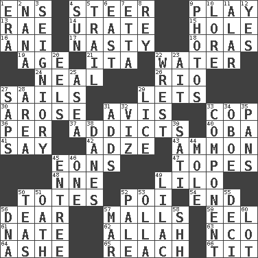ACROSS 1. Followers of ems 4. Bull 9. Live dramatic performance 13. Actress Charlotte 14. A salt of uric acid 15. Hollow 16. Black tropical American cuckoo 17. Offensive 18. Mouths or openings 19. Personal question 21. Call ___ day 22. Wetness 24. Actress Patricia 26. River (Sp.) 27. Moves on water 29. Allows 30. Came up 31. Deliberation 33. Police officer (slang) 36. For each 37. Inveterate users 40. Chief or king in Benin or Nigeria 41. Declare 42. Axlike tool, used for shaping wood 43. ID or VA city 45. Immeasurably long periods of time 47. Drinks excessively 48. Compass dir. 49. _ and Stitch 50. Hauls 52. Luau course 54. Conclude 56. Letter starter 57. Shopping centers 59. Snakelike fish 61. Nathan's nickname 62. Assad's deity 63. Non-commissioned officer (abbr.) 64. American tennis player Robert 65. Arrive at 66. Teat (slang) DOWN 1. Period 2. Grandmother 3. Signiory (variant) 4. Player for Phoenix 5. Go after with the intent to catch 6. 90 degrees 7. Singer James 8. Marina Del _, California 9. Pictures 10. Old wives' tales, e.g. 11. Having or resembling wings 12. Consenting reply 20. Snakelike fish 22. Take or capture by force 23. Small island 25. Toward the sea 27. Plant excrements 28. Length times width 29. Louse (plural) 31. Does sums 32. To wit 33. Piece 34. Mitch Miller's instrument 35. Zero-star reviews 38. Natives or inhabitants of Denmark 39. Suttee (variant) 44. Undercover agent 45. Main course 46. Single 49. Pale purple color 50. Afternoon social gatherings 51. Pledge 52. Diluted with white 53. Rounded earthenware pot or jar 55. Tenth: prefix 56. Heredity factor (abbr.) 57. Impair 58. Quiet! 60. Car dealer's back yard