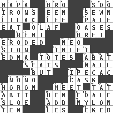 ACROSS 1. California wine valley 5. Sis' sibling 8. "Barney Miller" actor Jack 11. Metal shackles 13. Car or cant ending 14. Stitched 15. Pale purple color 16. Area sheltered from the wind 17. Light colored 18. Erode 19. Norwegian king 21. Fertile tracts in a desert 22. Painter Guido (1575-1642) 24. Cy Young winner Saberhagen 25. Worn away 27. Modern: prefix 29. The Jewish people; Israel 30. An arm off of a larger body of water 32. Pulitzer Prize-winning author Ferber 33. Lugs 35. Blind as ____ 39. Theater features 41. Promenade 42. Yet 43. Medicinal drug used to evoke vomiting 45. Words to Nanette 48. Keg 49. Person of subnormal intelligence 50. Confront 52. Make lace 55. "This won't hurt ____!" 56. Layer 57. Peak District village in England 59. A type of plum 60. Increase 61. Thermoplastic polyamide 62. "___ Little Indians" 63. French article 64. Made supply last DOWN 1. "Death on the ____" 2. Roberta Peters solo 3. Coward 4. Santa ___, CA 5. Actor Lugosi 6. Coral collection 7. Single 8. Gospel singer Marvin 9. A small or young owl 10. Washington bills 12. Biscuitlike quick bread 14. Coast Guard woman 20. Hat (slang) 21. Mitch Miller's instrument 23. Ferber et al. 25. Compass dir. 26. To free from 27. Compass dir. 28. Raised railways 30. ___ a Wonderful Life 31. Softens 33. The 19th letter of the Greek alphabet 34. Baseball player Mel 36. Sass 37. In the manner of 38. Affectionate concern, for short 40. Inky black, to poets 43. Frozen water 44. Eucharist need 45. Having high moral qualities 46. Constellation of myth 47. Observe 49. Vertical spar for supporting sails 50. Ancient Persian 51. Conclusions 53. _ vera 54. Be inclined (to) 56. Actor Linden 58. Color