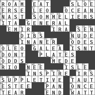 ACROSS 1. Wander aimlessly 5. Consume 8. A type of plum 12. Celtic language 13. Lion 14. Sea 15. Political cartoonist Thomas 16. Wine waiters 19. Call ___ day 20. Commissioned military rank 21. Arab leader 23. Retirement account (abbr.) 24. Elected rep. 27. Rights 30. Naked 31. More empty; more void 34. Lyric poems 35. Margarine 38. An organ shaped like a helmet 40. Is not 41. Do not 42. Food holders 44. Likelihood 45. Ancient Persian 46. _ de Janeiro 47. Born 50. Small island 53. Stimulate to action 57. Big collection agency 59. Supplementary 63. Strained 64. First name in cosmetics 65. Baking dish 66. Single time 67. Separate forcefully 68. Conclusion 69. Electrical Unit DOWN 1. Painter Guido (1575-1642) 2. Declaim 3. Indian state 4. Was introduced to 5. Otherwise 6. A really long time 7. Heavy book 8. _-fi 9. Area sheltered from the wind 10. Boat paddle 11. Followers of ems 14. Rounded earthenware pot or jar 17. Medical imaging device (abbr.) 18. Ewer handle 20. Smile widely 22. Foolish or stupid persons 24. Soap bubbles 25. Locale of original sin 26. A home for chicks 28. Paper or plastic container 29. Fastener 30. Annoying sounds 32. Pipe bend 33. 480, 500 or 516 sheets of paper 35. Aroma 36. Farming town in central California 37. Inside; within (prefix) 39. Had dinner 43. Singer Brickell 47. "Death on the ____" 48. Compass dir. 49. Eastern Standard Time (abbr.) 51. Woody, climbing, usually tropical plant 52. Spew [out] 54. Corncob 55. "Terrible" tsar 56. Tear apart 58. Proofreading order 59. Arrange properly for use 60. Purpose 61. Parent Teacher Association (abbr.) 62. For each 63. Pull behind