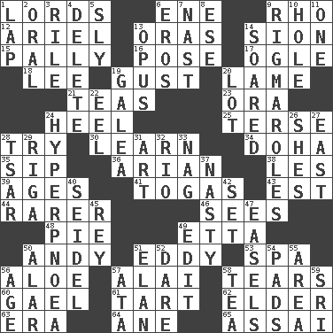 ACROSS 1. Titled peers of a realm 6. Compass dir. 9. 17th letter of the Greek alphabet 12. Satellite of Uranus 13. Mouths or openings 14. The Jewish people; Israel 15. Friendly 16. Introduce or present, as a question 17. Stare at amorously 18. Area sheltered from the wind 19. Abrupt rush of wind 20. Unable to walk 21. Afternoon social gatherings 23. Mouth or opening 24. The bottom of a shoe or boot 25. Laconic 28. Attempt to accomplish something 30. Memorize 34. Capital of the state of Qatar 35. Small drink 36. Believer in; advocate of (suffix) 38. French article 39. Ripens 41. Ancient Roman robes 43. Eastern Standard Time (abbr.) 44. More uncommon 46. Observes 48. Sliced dessert 49. Singer James 50. Actor Griffith 51. Whirlpool 53. Health resort 56. _ vera 57. Jai ____ 58. Lacerates 60. Highlander 61. Small pie 62. A person who is older than you are 63. Epoch 64. One (Scot) 65. Slender Brazilian palm DOWN 1. Pet locale 2. Of the mouth 3. Cause heat under the collar 4. Erase 5. Cunning 6. Greek god of love 7. Political cartoonist Thomas 8. Compass dir. 9. Complicated, petty procedures 10. Hollow 11. Single 13. Musical composition 14. Flew 19. An organ shaped like a helmet 20. Car dealer's back yard 22. Snakelike fish 24. Abnormally rapid or deep breathing 26. "______ My Girl" (Turtles hit) 27. Compass direction 28. Russian ruler of old 29. Capital of Latvia 31. Nonscientific branch of learning 32. _ de Janeiro 33. Tired old horse 37. Smutty 40. Beer mug 42. Arrange properly for use 45. Marina Del _, California 47. Artist's stands 49. Prepare for publication 50. Having or resembling wings 51. Style 52. Have the gumption 54. Groovy apts. 55. Type of rug 56. Grow older 57. _ moment's notice (2 wds.) 58. Afternoon social gathering 59. _ Lanka
