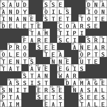 ACROSS 1. Saudi Arabian king (1953-1964) 5. Compass dir. 8. Heredity factor (abbr.) 11. Actor Griffith 12. Petroleums 14. Electrically charged atom 15. Empty; void 17. Proofreading order 18. Haul 19. Erase 21. Rough 23. Scottish cap 25. Native american tent (variation) 26. Conductor's collection 27. _-fi 28. Indian title of respect (Mr.) 31. Adept person 33. Perceive with the eye 35. Approach 37. Margarine 38. Beverage made from leaves 40. Chooses 41. Portable shelters 43. Compass dir. 45. Shoshoni 46. Make lace 47. "___ Maria" 50. Armor plate that protects the chest 52. Comedian Laurel of Laurel & Hardy 53. Armed conflict 54. Help 56. Break 61. In a ____ (agitated or irritated) 62. Celtic language 65. Relating to the nose 66. Parent Teacher Association (abbr.) 67. Puts into a specified state 68. Perceives with the eye 69. Direct toward a target or goal 70. Ingest 71. Falsehood DOWN 1. Alleged 2. Singer Murray 3. Hereditary estate 4. Centimeter-gram-second unit of force 5. Distress signal 6. Be seated 7. Opts 8. "Vaya con ____" 9. Observe 10. One (Scot) 13. Unemotional 16. Singer James 18. Three (prefix) 20. Hearing organs 22. Capital of Western Samoa 24. Confront 26. Lowest support of a structure 28. Back-to-school mo. 29. Pace 30. Big collection agency 31. Entreaty 32. Monthly bill 34. Car or cant ending 36. Horse sense 37. Baseball player Mel 39. Afresh 42. Suttee (variant) 44. Mild oath 48. Flower holders 49. Main course 51. SW Asia republic 52. Fast jet (abbr.) 54. Opposed to 55. Thailand, formerly 57. Vertical spar for supporting sails 58. At sea 59. Highlander 60. Otherwise 61. Health resort 63. R.R. building 64. Eastern Standard Time (abbr.)