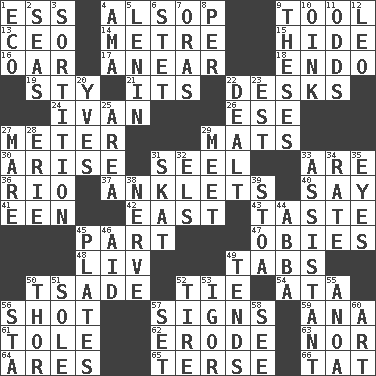 ACROSS 1. Double-curved letter 4. Columnist Joseph or Stewart 9. Utensil 13. Corporate head (abbr.) 14. Distance measurement (Brit.) 15. Flintstone garb 16. Rowing implement 17. Approach 18. Inside; within (prefix) 19. Filthy place 21. ___ a Wonderful Life 22. Writing tables 24. _ the terrible 26. Compass dir. 27. Distance measurement 29. Floor protectors 30. Originate 31. Sew up the eyelids of hawks and falcons 33. "We ___ not amused" (Victoria) 36. River (Sp.) 37. Short socks 40. Declare 41. Car or cant ending 42. 90 degrees 43. Clothes sense 45. Component 47. Off-Broadway awards 48. 54 in ancient Rome 49. Bar bills 50. Sadhe (variant) 52. Neckwear 54. "One Day ___ Time" 56. Opportunity 57. Attaches a signature 59. Santa ___, CA 61. Lacquered or enameled metalware 62. Eat (away) 63. And not 64. Ancient Greek god of war 65. Laconic 66. Make lace DOWN 1. Environmental prefix 2. Oceans 3. Conclusion 4. Housemaid (var.) 5. Soviet premier 1918-24 6. Proofreading order 7. Mouths or openings 8. For each 9. College papers 10. Pig sound 11. Likelihood 12. Lion 20. Jacques Cousteau's middle name 22. Started a card game 23. Eastern Standard Time (abbr.) 25. Length times width 27. Female horse 28. 4th largest of the Great Lakes 29. Confront 31. Three-handed card game 32. Raised railways 33. Helper 34. Pace 35. Snake ____ (dice throw) 38. Impudent aggressiveness 39. Portico 44. Swedish rock group 45. Food holders 46. Assist 49. Is inclined (to) 50. Son of Odin 51. Not divided or shared with others 52. Become fatigued 53. Composer Stravinsky 55. Small Philippine buffalo 56. R.R. building 57. Put into a specified state 58. Observe 60. Tate display