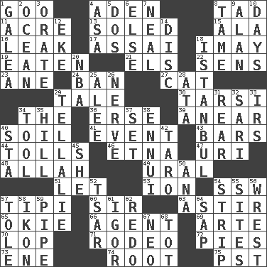 ACROSS 1. Thick or sticky substance 4. An important port of Yemen 8. Small amount or degree 11. Measure of real estate 13. Having a sole or soles 15. In the manner of 16. Path through which fluid escapes 17. Slender Brazilian palm 18. "If ____ say so..." 19. Eroded 21. Raised railways 22. Elected reps. 23. A saturated hydrocarbon 24. Forbid 27. Domesticated feline 29. Lie 30. Tarsus (plural) 34. Definite Article 36. Celtic language 39. Approach 40. Land 41. Happening 43. Oblong pieces of solid material 44. For Whom the Bell _____ 46. Inactive volcano in Sicily 47. RI univ. 48. Assad's deity 49. Mountain range 51. Allow 53. Electrically charged atom 54. Compass dir. 57. Native american tent (variation) 60. Title for a knight 63. Moving or stirring 65. Migrant worker of the '30s 66. Rep 69. Johnson of "Laugh-In" 70. Trim (branches) 71. Cowboy competition 72. Sliced desserts 73. Compass dir. 74. Carrot, for example 75. Pacific Standard Time (abbr.) DOWN 1. An organ shaped like a helmet 2. Sea 3. Declaim 4. White ___ sheet 5. Two (Sp.) 6. Otherwise 7. Be tempered by heat 8. Docile 9. Actor Alda or Thicke 10. 24-hour periods 12. Supplement with great effort 14. Compact _ 18. Byzantium, centuries later 20. Basketball assoc. 25. Toward shelter 26. Effrontery 28. "One Day ___ Time" 29. Copy Pinocchio 31. Tail end 32. Indian skirt 33. Big collection agency 34. Instrument 35. Land elevation 37. Put into a specified state 38. World-weariness 40. R.R. building 42. Edible starchy tuberous root 45. A female animal or person 50. Santa ___, CA 52. Russian ruler of old 54. Empty completely 55. Settings 56. Take or capture by force 57. Lacquered or enameled metalware 58. Picture 59. Corncob 61. Composer Stravinsky 62. Do over again 64. Plant excrement 67. Modern: prefix 68. Small child