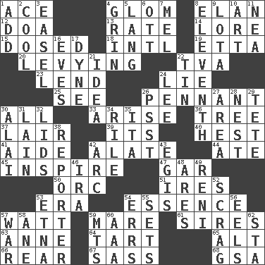 ACROSS 1. Adept person 4. Take by theft 8. Style 12. ___ good deed 13. Assign a rank or rating to 14. Old wives' tales, e.g. 15. Administered medicine 18. International (abbr.) 19. Singer James 20. Imposing or collecting, as a tax 22. Federal power corp. 23. Grant temporary use of 24. Falsehood 25. Observe 26. Pre-World Series prize 30. Everything 33. Get up 36. Family _ (genealogy) 37. Den 39. ___ a Wonderful Life 40. Behest 41. Assistant 42. Having winglike extensions 44. Had dinner 45. Heighten or intensify 47. Slender fish 50. The grampus (Milton) 51. Angers 53. Period 54. Center 57. Electrical Unit 59. Female horse 61. Begets 63. Queen of England 1702-14 64. Small pie 65. The first octave above the treble staff 66. Hitchcock's "____ Window" 67. Backtalk 68. Girls' org. (abbr.) DOWN 1. Find the sum of 2. Calm and collected 3. Artist's stand 4. Smile widely 5. Long (Scottish) 6. Baseball player Mel 7. Cartoonist voice _ Blanc 8. Veterans Day date 9. Globular water bottle used in Asia 10. Tate display 11. Teachers' org. 16. Nights before holidays 17. Centimeter-gram-second unit of force 21. The main thing one is thinking about 22. Shallow baking pan 24. Area sheltered from the wind 26. Inconspicuous attention getter 27. Type of rug 28. Egg locale 29. False hair 30. Mountain range southwest of Kyrgyzstan 31. (Had) reclined 32. Hats (slang) 34. Cause heat under the collar 35. Call ___ day 38. News announcer 42. Curve 43. Armor plate that protects the chest 46. Lyricist Gershwin 48. Ancient Greek god of war 49. Painter Guido (1575-1642) 52. Lean end of the neck 53. Inactive volcano in Sicily 54. Blunders 55. Arranges properly for use 56. Snakelike fish 57. Armed conflict 58. One (Scot) 59. Mountains (abbr.) 60. Auto club (abbr.) 62. R.R. building