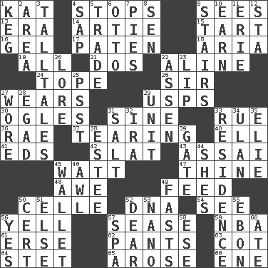 ACROSS 1. Krazy ___ of comics 4. Discontinues 9. Perceives with the eye 13. Period 14. Nick name for Arthur 15. Small pie 16. Set 17. Eucharist need 18. Operatic vocal solo 19. Everything 21. Two (Sp.) 22. Place in a line 24. Drink excessively 26. Title for a knight 27. Puts on (as clothing) 29. United States Postal Service (abbr.) 30. Stares at amorously 31. Trig term 33. Regret 36. Actress Charlotte 37. Separating forcefully 40. Pipe bend 41. Begley and Asner 42. Narrow board 43. Slender Brazilian palm 45. Electrical Unit 47. One or ones belonging to thee 48. Deep reverence 49. Nourish 50. Cell (Danish) 52. Heredity factor (abbr.) 54. Observe 56. Shout 57. Gospel singer Marvin 59. Basketball assoc. 61. Celtic language 62. Leg coverings 63. Small bed 64. Proofreading order 65. Came up 66. Compass dir. DOWN 1. Cask 2. Type of rug 3. Baron Munchausen's specialties 4. Plant excrement 5. Exchange 6. "Beetle Bailey" pooch 7. Sliced desserts 8. Elected rep. 9. Flight of steps 10. Merit 11. One of the Great Lakes 12. R.R. building 20. Old wives' tales, e.g. 22. NE Netherlands city 23. Mouth edge 25. Inconspicuous attention getter 27. Had on 28. Mild oath 29. A single undivided whole 31. Table seasoning 32. Lyricist Gershwin 33. Dwelling 34. ____ Bator, Mongolia 35. Writer Wiesel 38. First name in cosmetics 39. Yard entry 44. "______ My Girl" (Turtles hit) 45. Place for singles 46. Leather borer 49. Goes without food and/or water 50. Foregone conclusion 51. Otherwise 52. Letter starter 53. Billionth: prefix 55. Inky black, to poets 56. Consenting reply 57. Health resort 58. Compass dir. 60. Had dinner