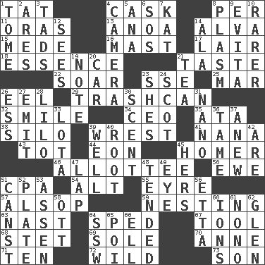 ACROSS 1. Make lace 4. Keg 8. For each 11. Mouths or openings 13. Small Philippine buffalo 14. Inventor's middle name 15. Ancient Persian 16. Vertical spar for supporting sails 17. Den 18. Core 21. Clothes sense 22. Fly high 23. Compass dir. 25. Third mo. 26. Snakelike fish 29. File 13 32. Grin 34. Corporate head (abbr.) 35. "One Day ___ Time" 38. Grain storage tower 39. Take or capture by force 41. Grandmother 43. Small child 44. Period of immesurable duration 45. Homing pigeon 46. One to whom something is allotted 50. She-sheep 51. Accounting whiz (abbr.) 54. Keyboard modifier key 55. Jane of fiction 57. Columnist Joseph or Stewart 59. Inhabiting a nest 63. Political cartoonist Thomas 64. Moved rapidly 67. Utensil 68. Proofreading order 69. Not divided or shared with others 70. Queen of England 1702-14 71. "___ Little Indians" 72. Uncontrolled 73. Boy, to dad DOWN 1. Heavy book 2. Ancient Greek god of war 3. Bits 4. Device for capturing images 5. Santa ___, CA 6. Mayday 7. Krazy ___ of comics 8. Suffix with ecto or cyto 9. Webber/Rice musical 10. More valued for its uncommonness 12. Perceives with the eye 14. In the manner of 19. Musical sound 20. Auto 21. Beverage made from leaves 23. "______ My Girl" (Turtles hit) 24. Native of Scotland 26. Double-curved letter 27. Send forth 28. _ and Stitch 30. Aroma 31. Billionth: prefix 33. Globular water bottle used in Asia 36. Not wild 37. Afresh 39. Not ill 40. Carrot, for example 42. "We ___ not amused" (Victoria) 45. Possessive pronoun 47. Infant locale 48. Looked after 49. Sight organ 51. 2nd pers. sing. pres. of can (arch.) 52. Food holder 53. NE Netherlands city 56. Singer James 58. Baseball player Mel 60. Charged atoms 61. Words to Nanette 62. Small, secluded valley 64. Compass dir. 65. Luau course 66. Pipe bend