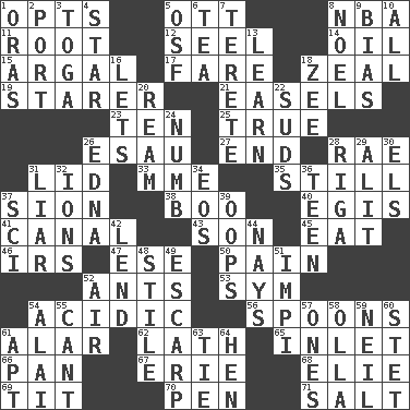 ACROSS 1. Elects 5. Baseball player Mel 8. Basketball assoc. 11. Carrot, for example 12. Sew up the eyelids of hawks and falcons 14. Petroleum 15. Therefore, facetiously 17. Conductor's collection 18. Ardor 19. A viewer who gazes fixedly 21. Artist's stands 23. Nine, plus one 25. Loyal 26. Son of Isaac 27. Conclude 28. Actress Charlotte 31. Hat (slang) 33. Madame (abbr.) 35. Not moving 37. The Jewish people; Israel 38. Sometimes accompanies a hiss 40. The front part of a cuirass 41. Lessep's creation 43. Male offspring 45. Ingest 46. Big collection agency 47. Compass dir. 50. Ache 52. Pismires 53. Symbol (abbr.) 54. Being or containing an acid 56. Soup utensils 61. Having or resembling wings 62. Thin strip of wood or metal 65. An arm off of a larger body of water 66. Baking dish 67. One of the Great Lakes 68. Writer Wiesel 69. Teat (slang) 70. Animal enclosure 71. Table seasoning DOWN 1. Mouths or openings 2. Left side of a ship or aircraft 3. Ancient Roman robe 4. Play the lead 5. Order of Saint Francis (abbr.) 6. Afternoon social gathering 7. Cigar-shaped 8. Christmas carol 9. Prejudice 10. Everything 13. Memorize 16. Allows 18. Last letter of the English alphabet 20. 480, 500 or 516 sheets of paper 22. Beer foam 24. Unfeeling 26. Pulitzer Prize-winning author Ferber 28. Port city in Latvia 29. Came down and settled, as after flight 30. Raised railways 31. One who doesn't tell the truth 32. Charged particles 34. Greek goddess of the dawn 36. Adolescent 37. _-fi 39. I made a mistake 42. Grant temporary use of 44. Negative votes 48. Vertical member of a panel or frame 49. Fortification 51. Body of Kaffir warriors 52. Atmosphere 54. Jai ____ 55. Patter 57. Singles 58. Spanish pot 59. Famous astronaut Armstrong 60. Proofreading order 61. Fitting 63. Neckwear 64. Layer