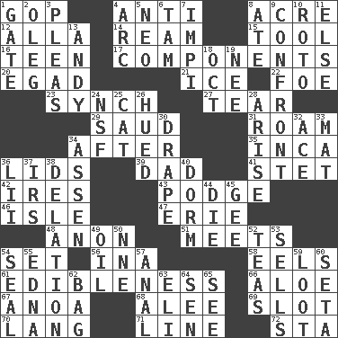 ACROSS 1. Grand Old Party 4. Against 8. 1/640 square mile 12. Silent film actress Nazimova 14. 480, 500 or 516 sheets of paper 15. Utensil 16. Adolescent 17. Parts 20. Mild oath 21. Frozen water 22. Enemy 23. Synchronize (abbr.) 27. Lacerate 29. Saudi Arabian king (1953-1964) 31. Wander aimlessly 34. Following 35. South American Indian 36. Hats (slang) 39. June honoree 41. Proofreading order 42. Angers 43. Plash 46. Capri or Wight 47. 4th largest of the Great Lakes 48. At once, immediately (arch.) 51. Confronts 54. Put into a specified state 56. _ tizzy (2 wds.) 58. Snakelike fish 61. The property of being fit to eat 66. Medicinal plant 67. Small Philippine buffalo 68. Toward shelter 69. Narrow, elongated depression 70. Long (Scottish) 71. Actor's bit 72. R.R. building DOWN 1. Yard entry 2. Cassini of fashion 3. Entreaties 4. Curve 5. Modern: prefix 6. Scottish cap 7. Body of Kaffir warriors 8. Had dinner 9. Meet 10. Printing process, for short 11. Otherwise 13. "60 Minutes" Commentator Rooney 18. Sep. follower 19. Born 24. Science/research agcy. 25. Feline 26. Became colored 28. Ascend 30. Window treatment 32. Adept person 33. Floor covering 34. NE Netherlands city 36. Cards in a Roman deck? 37. Big collection agency 38. Accusation by an informer 40. Dormintory (informal) 44. Expire 45. Turn to the right 49. Petroleum 50. Compass dir. 52. Beverages made from leaves 53. Exchanges for money 54. Lick closed 55. Pulitzer Prize-winning author Ferber 57. Of or related to the anus 59. Spoils 60. Bristle 62. Container for groceries 63. Biblical high priest 64. Elected rep. 65. Perceive with the eye