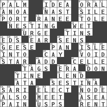 ACROSS 1. Inside of hand 5. The main thing one is thinking about 9. Taken by mouth 13. Small Philippine buffalo 14. Political cartoonist Thomas 15. Filth; sediment 16. Sweet dark-red dessert wine 17. Indian princess (variant) 18. Lacquered or enameled metalware 19. Nestling 21. Dripping 22. Goad 23. Airtight sealed metal containers 24. Begley and Asner 27. Hearing organ 28. Elected reps. 29. Honkers 31. Baking dish 32. Capri or Wight 36. To the inside or interior of 37. Island 38. Lacking any legal or binding force 39. Play the lead 40. Say or write further 41. Cell (Danish) 42. Labels 44. Epoch 46. Spanish title 47. Prong on a fork 48. Grant temporary use of 50. _ moment's notice (2 wds.) 51. French poetic form 54. Indian skirt 56. Choose 58. Connecting point 60. In addition 61. Rendezvous 62. Toward the sea 63. Ache 64. United States Postal Service (abbr.) 65. Monthly bill DOWN 1. Infant food 2. At once, immediately (arch.) 3. Old wives' tales, e.g. 4. Taiwanese island in East China Sea 5. More lacking in sense or substance 6. Mild oath, euphamism for damn 7. Compass dir. 8. Had dinner 9. Clearly or manifestly demonstrative 10. Disturbances 11. Everything 12. Area sheltered from the wind 17. Port city in Latvia 20. Relationship diagram 21. Acquire through effort 23. "___ Little Indians" 24. The front part of a cuirass 25. Undesirable depression on a surface 26. Bristle 28. Declare 30. Conclusion 31. Groovy apt. 33. Exchanged or delivered for money 34. _ and Stitch 35. Locale of original sin 37. Music discs 40. Personal question 41. Patter 43. Santa ___, CA 44. Opts 45. State of inaction 47. Tarsus (plural) 49. Middle Eastern gold or silver currency 51. Ooze 52. Olfactory organ 53. An important port of Yemen 54. Plant excrement 55. Wing 56. Australian flightless bird 57. French article 59. Ingest