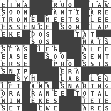 ACROSS 1. Inactive volcano in Sicily 5. Friend of Pooh 8. The 23rd letter of the Hebrew alphabet 11. Within a short period 12. Against 14. "We ___ not amused" (Victoria) 15. Marketplace scale 17. Confronts 18. Area sheltered from the wind 19. Core 21. Male child 22. Infant locale 23. Supplement with great effort 24. Two (Sp.) 25. Make lace 27. Mayday 28. Floor protectors 31. Oceans 35. Part of a journey 37. Toward shelter 38. Comfort 39. "Barney Miller" actor Jack 41. Emitted 42. Celtic language 43. Adept person 45. Fast planes 46. Sever or remove by pinching or nipping 47. Period 49. Symbol (abbr.) 51. Experiment locale 52. Lion 55. Allow 57. Wet nurse (var.) 60. Catching in a trap 62. Mouth or opening 63. The wife of a rajah (variant) 65. Add up to 66. Victory 67. Makes supply last 68. Wig 69. Arrange properly for use 70. She-sheep 71. Ancient Greek god of war DOWN 1. First name in cosmetics 2. Cod relative 3. Trap for birds or small mammals 4. Singer Murray 5. Actress Charlotte 6. Washington bills 7. "Beetle Bailey" pooch 8. Baron Munchausen's specialties 9. Type of rug 10. Shed a tear 13. Is not 16. Extremities 17. Makes clutter 20. Calm and collected 26. Collect or gather 29. Portable shelter 30. Puts into a specified state 31. Observes 32. Merit 33. Aide 34. Oozy 36. Republican Party 40. Threatening words 44. Northwest Algerian city 48. Blind as ____ 50. Female horse 52. 61 cubic inches 53. Related on the mother's side 54. Stares 55. Coldest temperatures 56. One of the Great Lakes 58. Create 59. Afresh 61. Round or rotation of duties 64. Compass dir.