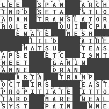 ACROSS 1. Area sheltered from the wind 4. Connect, as a bridge 8. Bowlike part 12. Southeast Asian peninsula 14. Stalk of a moss capsule 15. Grain storage tower 16. First man 17. Interpreter 20. Hero or heavy, e.g. 21. Fr. "Yes" 22. Accounting whiz (abbr.) 23. Maternal 27. Soft 29. _ and Stitch 31. Assistant 34. Taiwanese island in East China Sea 35. Afternoon social gatherings 36. Domed church section 39. And so on (abbr.) 41. Is not 42. Confront 43. Street urchin 46. Queen of England 1702-14 47. NW Algerian seaport 48. Roberta Peters solo 51. _____ steamer (cargo ship) 54. Sep. follower 56. Big collection agency 58. 90 degrees 61. Appease 66. "Tell ____ the Marines!" 67. Edible starchy tuberous root 68. Female horse 69. Actress Patricia 70. System (abbr.) 71. Ache 72. Compass dir. DOWN 1. One who doesn't tell the truth 2. Inside; within (prefix) 3. Peak District village in England 4. Fast jet (abbr.) 5. For each 6. "One Day ___ Time" 7. Billionth: prefix 8. White ___ sheet 9. Actors Guy, Robert Welles, and Clint 10. Hoof sound 11. Israeli folk dance 13. Sign of something about to happen 18. Player for Phoenix 19. Whopper 24. According to 25. Teat (slang) 26. Otherwise 28. Smooth fabric 30. Outlay 32. Daniel's nick name 33. Eastern Standard Time (abbr.) 34. Distance measurement 36. Nursemaid (var.) 37. Writing instrument 38. Legislators 40. Heavy open wagon 44. Third mo. 45. _ tizzy (2 wds.) 49. One more than two 50. Tate display 52. Count _ (2 wds.) 53. Eucharist need 54. Chooses 55. Supercomputer manufacturer 57. Simple or foolish person 59. Comedian Laurel of Laurel & Hardy 60. Lacquered or enameled metalware 62. Plant holder 63. American Automobile Association (abbr.) 64. Three (prefix) 65. Car or cant ending