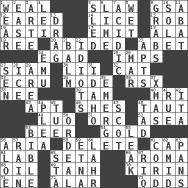 ACROSS 1. Welt 5. Cole _ (cabbage dish) 9. Girls' org. (abbr.) 12. Having ears or earlike features 14. Louse (plural) 15. Director Reiner 16. Being in motion 17. Send forth 18. Wing 19. Portuguese money of account (variant) 20. Stayed 23. Collude with 24. Mild oath 25. Naughty children 27. Thailand, formerly 30. Cards in a Roman deck? 32. Domesticated feline 33. Shade of tan 34. Method 36. Acura sports coupe 38. Born 39. Scottish cap 40. Medical imaging device (abbr.) 43. Fitting 46. "______ My Girl" (Turtles hit) 48. Tense 49. Nilotic language 51. The grampus (Milton) 52. Toward the sea 53. Fermented drink made from hops 54. Gilt 56. Operatic vocal solo 58. Erase 61. Head covering 64. Experiment locale 65. Stalk of a moss capsule 66. Odor 68. Petroleum 69. Hyperbolic tangent 70. Japanese brewing company 71. Compass dir. 72. Having or resembling wings 73. Likelihood DOWN 1. Put on (as clothing) 2. Relaxation 3. Johnson of "Laugh-In" 4. Luau accessory 5. Downhill vehicle 6. Citrus frut 7. Being or containing an acid 8. Soggy 9. Catches 10. Flatfish 11. Blind as ____ 13. To be drawn or hauled along 21. Lip ointment 22. Foolish or stupid persons 23. Flats, for short 24. Australian flightless bird 26. Make imperfect 27. Elected rep. 28. Frozen water 29. Length times width 31. Potato state 35. Develop 37. Dec. holiday 41. Regret 42. Call ___ day 44. Entreaty 45. Third day of the wk. 47. Native of Scotland 48. Bit 50. Severe or trying experience 53. Instruction Manual for Humans 55. Path through which fluid escapes 56. Medicinal plant 57. Water falling in drops from the sky 59. Inactive volcano in Sicily 60. Cowardly lion portrayer 61. Drawstring 62. Among 63. Baking dishes 65. R.R. building 67. River (Sp.)