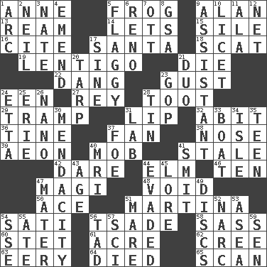ACROSS 1. Queen of England 1702-14 5. Tree-dwelling hopper 9. Actor Alda or Thicke 13. 480, 500 or 516 sheets of paper 14. Allows 15. Filth; sediment 16. Quote 17. Before Barbara or Clara 18. Go away! 19. Small, flat, pigmented spot on the skin 21. Expire 22. Mild oath, euphamism for damn 23. Abrupt rush of wind 24. Car or cant ending 27. Marina Del _, California 28. A blast of a horn 29. _____ steamer (cargo ship) 31. Mouth edge 32. "This won't hurt ____!" 36. Prong on a fork 37. Avid follower 38. Characteristic smell of wine 39. A really long time 40. Disorderly crowd 41. Having lost freshness 42. Have the gumption 44. Shade tree 46. Nine, plus one 47. Wise men 48. Null 50. Adept person 51. Chrissie's court nemesis 54. Suttee (variant) 56. Sadhe (variant) 58. Backtalk 60. Proofreading order 61. 43,560 square feet 62. Algonquian 63. Suggestive of the supernatural 64. Passed on 65. Skim DOWN 1. Curve 2. Famous astronaut Armstrong 3. Nathan's nickname 4. Make improvements or corrections to 5. Insipid 6. Western Nevada city 7. Baseball player Mel 8. Girls' org. (abbr.) 9. Aide 10. It is permitted: Lat. 11. In the manner of 12. Fish or hair follower 17. Trig term 20. Canvas cover 21. Superhero pair 23. Republican Party 24. Singer James 25. One of the Great Lakes 26. Billionth: prefix 28. Shallow baking pan 30. Ananias' fault 31. Experiment locale 33. Water vessel 34. Capri or Wight 35. Adolescent 37. Enemy 40. Medical imaging device (abbr.) 41. Stricken, poetically 43. Ripen 44. Eluded 45. Old wives' tales, e.g. 47. Mother 49. Flat circles 51. Female horse 52. Drug cop 53. At sea 54. Compass dir. 55. Had dinner 56. Bit 57. _-fi 59. Elected rep.