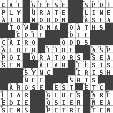 ACROSS 1. Feline 4. Honkers 9. Specific locale 13. Apply oneself diligently 14. A salt of uric acid 15. Actor's bit 16. Atmosphere 17. Person of subnormal intelligence 18. At sea 19. Pull behind 21. Heredity factor (abbr.) 22. Expletives 24. ____ d'Azur (French Riviera) 26. Expire 27. Capital of Egypt 29. Likelihood 30. Tree or shrub in the Birch family 31. Periodic rise and fall of the sea level 33. Cleo's killer 36. Luau course 37. Speakers 40. Ocean 41. Elected rep. 42. Having or resembling wings 43. Trials 45. Synchronize (abbr.) 47. From or relating to Ireland 48. Born 49. Indian titles of respect 50. Came up 52. Eastern Standard Time (abbr.) 54. And so on (abbr.) 56. One who doesn't tell the truth 57. Adhesives 59. Sandy's bark 61. Singer Brickell 62. Flexible twig of a willow tree 63. Teachers' org. 64. Elected reps. 65. _ dish (used to culture cells) 66. "___ Little Indians" DOWN 1. Numbers guy (abbr.) 2. Came down and settled, as after flight 3. Polypeptide antibiotic 4. Chewing product 5. Eat (away) 6. Merit 7. Portico 8. Car or cant ending 9. Chalkboards 10. Expression of disdain 11. Washington bills 12. Beverage made from leaves 20. Had on 22. More peculiar 23. Help 25. "Corrida" creature 27. Balmoral and tarboosh 28. Medicinal plant 29. Scent 31. Baby powder 32. Call ___ day 33. Aide 34. Arranges properly for use 35. Romantic infatuation 38. Indian princess (variant) 39. Move through with a circular motion 44. One of the Great Lakes 45. Sounds asleep 46. It is so 49. Navigate 50. Helper 51. Precipitation 52. Otherwise 53. Set of matching outer garments 55. Algonquian 56. French article 57. Grand Old Party 58. _ Lanka 60. Avid follower