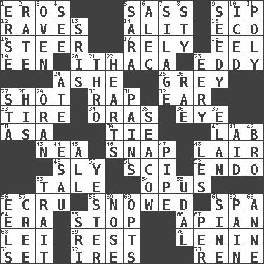 ACROSS 1. Greek god of love 5. Backtalk 9. Small drink 12. All-night dance parties 14. Set down 15. Environmental prefix 16. Guide 17. Depend 18. Snakelike fish 19. Car or cant ending 20. New York city 23. Whirlpool 24. American tennis player Robert 25. Jennifer or Joel 27. Attempt 30. Strike 32. Ewer handle 33. Become fatigued 34. Mouths or openings 36. Sight organ 38. White ___ sheet 39. Neckwear 40. Experiment locale 43. Teachers' org. 46. Fastener 48. Den 49. Insidious 51. _-fi 52. Inside; within (prefix) 53. Lie 54. Musical composition 56. Shade of tan 58. Frozen precipiation fell 61. Health resort 64. Epoch 65. Cease 66. Bee-related 68. Luau accessory 69. Remainder 70. Soviet premier 1918-24 71. Arrange properly for use 72. Angers 73. French philosopher Descartes DOWN 1. Celtic language 2. Assign a rank or rating to 3. Baking chamber 4. Observe 5. "Two Mules for Sister ____" 6. Actor Baldwin 7. Fodder prepared in a silo 8. Filthy place 9. Morally degraded 10. On the rocks 11. More than one (prefix) 13. Indian titles of respect 21. Through, poetically 22. Centers 23. Suggestive of the supernatural 24. Had dinner 26. Actress Charlotte 27. R.R. building 28. Part of HMS, perhaps 29. Northwest Algerian city 31. Aches 35. Manatee 37. Liveliness 41. Assist 42. Sis' sibling 44. Son of Isaac 45. 100% 47. Corncob 48. French article 50. Last 53. Distinguishing feature 55. Allodial 56. Snakelike fish 57. Algonquian 59. Olfactory organ 60. Chooses 61. Trig term 62. Ache 63. Singer Murray 65. Indian title of respect (Mr.) 67. For each