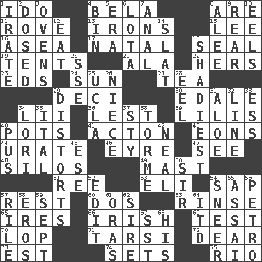 ACROSS 1. Wedding promise 4. Actor Lugosi 8. "We ___ not amused" (Victoria) 11. Be footloose 13. Metal shackles 15. Area sheltered from the wind 16. At sea 17. Relating to or accompanying birth 18. Lick closed 19. Portable shelters 21. According to 22. Possessive pronoun 23. Begley and Asner 24. Player for Phoenix 27. Beverage made from leaves 29. Tenth: prefix 30. Peak District village in England 34. Cards in a Roman deck? 36. For fear that 39. Ms. Damita and namesakes 40. Cooking vessels 41. 13-14th century defensive garment 43. Immeasurably long periods of time 44. A salt of uric acid 46. Jane of fiction 47. Perceive with the eye 48. Grain storage towers 49. Vertical spar for supporting sails 51. To sift 53. Connecticut Ivy Leaguer 54. Plant excrement 57. Take ten 60. Two (Sp.) 63. Remove soap 65. Angers 66. From or relating to Ireland 69. Trial 70. Chop off 71. Tarsus (plural) 72. Letter starter 73. Eastern Standard Time (abbr.) 74. Puts into a specified state 75. River (Sp.) DOWN 1. Feeling or showing extreme anger 2. Administered medicine 3. Baking chambers 4. Storage container 5. Period 6. Globular water bottle used in Asia 7. Of or related to the anus 8. Toward shelter 9. Located in or toward the back 10. Snakelike fish 12. Consume 14. Narrow board 18. Most questionable 20. Compass dir. 25. Southern CA. univ. 26. Sibling's daughter 28. Snakelike fish 29. What propaganda does 31. Medicinal plant 32. Actor's bit 33. Double-curved letter 34. Australian parrot (variant) 35. Slanted text style (abbr.) 37. Filthy place 38. Singer Mel 40. Fluid product of inflammation 42. Anneal 45. Compass dir. 50. Title for a knight 52. Prepare for publication 54. Contemptuous expression 55. Slender Brazilian palm 56. Stone: prefix 57. Cause heat under the collar 58. Greek god of love 59. Back-to-school mo. 61. Mouths or openings 62. Title for a man of rank and authority 64. It would 67. Fast jet (abbr.) 68. Part of HMS, perhaps
