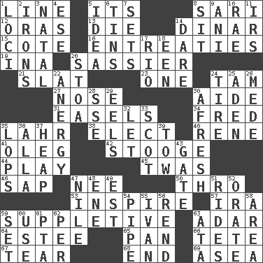 ACROSS 1. Actor's bit 5. ___ a Wonderful Life 8. Indian skirt 12. Mouths or openings 13. Pass on 14. Middle Eastern gold or silver currency 15. ____ d'Azur (French Riviera) 16. Pleas 19. _ tizzy (2 wds.) 20. More lively and spirited 21. Narrow board 23. Single 24. Scottish cap 27. Olfactory organ 30. Assistant 31. Artist's stands 34. Flintstone 35. Cowardly lion portrayer 38. Choose 40. French philosopher Descartes 41. Cassini of fashion 42. Moe Howard, for one 44. Frolic 45. It was, poetically 46. Plant excrement 47. Born 50. Through, poetically 53. Motivate 57. Lyricist Gershwin 59. Supplementary 63. The sixth month of the Jewish calendar 64. First name in cosmetics 65. Baking dish 66. Wig 67. Separate forcefully 68. Conclude 69. Toward the sea DOWN 1. Venues 2. Removes the wrinkles 3. Brizilian seaport 4. Compass dir. 5. The main thing one is thinking about 6. Canisters 7. Arranges properly for use 8. Be seated 9. Cuckoo 10. Actress Charlotte 11. Big collection agency 14. Have the gumption 17. _ de Janeiro 18. Car or cant ending 20. Portico 22. Disorder of the immune system 24. Hoop that covers a wheel 25. An important port of Yemen 26. Ancient Persian 28. Compass dir. 29. Snakelike fish 30. Anew 32. Allow 33. Native of Scotland 35. Chops off 36. Silent film actress Nazimova 37. Pile 39. Pull behind 43. Yard entry 47. The longest river in the world 48. Compass dir. 49. Eastern Standard Time (abbr.) 51. Amusement-park features 52. Declaim 54. Corncob 55. _ the terrible 56. Tear apart 58. Type of rug 59. Put into a specified state 60. Purpose 61. Parent Teacher Association (abbr.) 62. For each 63. "One Day ___ Time"