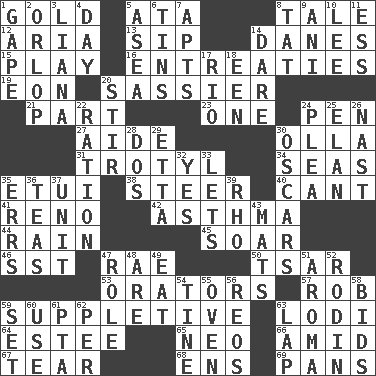 ACROSS 1. Aureate 5. "One Day ___ Time" 8. Story 12. Operatic vocal solo 13. Small drink 14. Natives or inhabitants of Denmark 15. Romp 16. Pleas 19. A really long time 20. More impudent 21. Piece 23. Single 24. Fenced enclosure 27. Helper 30. Rounded earthenware pot or jar 31. Trinitrotoluene 34. Oceans 35. Needle case 38. Bull 40. Patter 41. Western Nevada city 42. Respiratory problem 44. Water falling in drops from the sky 45. Fly high 46. Fast jet (abbr.) 47. Actress Charlotte 50. Russian ruler of old 53. Speakers 57. Director Reiner 59. Supplying deficiencies 63. Farming town in central California 64. First name in cosmetics 65. Modern: prefix 66. Among 67. Lacerate 68. Followers of ems 69. Baking dishes DOWN 1. Open wide 2. Fourth or lowest deck 3. Climbing, woody, usually tropical vines 4. 24 hours 5. At sea 6. Airtight sealed metal containers 7. Tenement units (abbr.) 8. Make lace 9. Black tropical American cuckoo 10. Area sheltered from the wind 11. Curvy letter 14. Have the gumption 17. _ de Janeiro 18. Car or cant ending 20. Commotion 22. Food allowance for one day 24. Entreaty 25. Flair 26. Political cartoonist Thomas 28. Two (Sp.) 29. Singer James 30. Motion picture awards 32. Consenting reply 33. Allows 35. Blunders 36. Afternoon social gatherings 37. A single undivided whole 39. 17th letter of the Greek alphabet 43. Floor protectors 47. Hero or heavy, e.g. 48. "We ___ not amused" (Victoria) 49. Ingest 51. Scent 52. "The Thinker" sculptor 54. Prong on a fork 55. Baking chamber 56. Vintage cars 58. Auction offers 59. Put into a specified state 60. Purpose 61. Parent Teacher Assoc. 62. For each 63. Infant locale