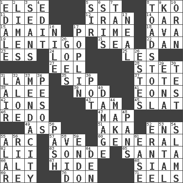 ACROSS 1. Otherwise 5. Fast jet (abbr.) 8. Ring climax 11. Passed on 12. SW Asia republic 14. Boat paddle 15. With great haste 17. First class 18. Actress Gardner 19. Small, flat, pigmented spot on the skin 21. Ocean 22. One of the 12 tribes of Israel 23. Curvy letter 24. Trim (branches) 25. French article 27. Snakelike fish 28. Proofreading order 31. Desk light 35. Small drink 37. Carry 38. Toward shelter 39. Lower and raise head in agreement 41. Immeasurably long periods of time 42. Charged atoms 43. Scottish cap 45. Narrow board 46. Make new 47. Atlas unit 49. Cleo's killer 51. Alias (abbr.) 52. Followers of ems 55. Curve 57. "___ Maria" 60. Commissioned military rank 62. Cards in a Roman deck? 63. Something which is sent 65. Before Barbara or Clara 66. The first octave above the treble staff 67. Flintstone garb 68. Thailand, formerly 69. Marina Del _, California 70. Spanish title 71. Snakelike fish DOWN 1. Peak District village in England 2. Citrus fruits 3. Actors Connery and Penn 4. Prepare for publication 5. Title for a knight 6. Indian titles of respect 7. Docile 8. Inedible or poisonous agaric 9. Polynesian shrub of the pepper family 10. NW Algerian seaport 13. Actress Patricia 16. Mediterranean tributary 17. Cotton for raincoats, e.g. 20. Leaves 26. _____ Park, CO 29. Inactive volcano in Sicily 30. Trial 31. Den 32. _ vera 33. Ananias' fault 34. Mexican monetary units 36. Plant holder 40. Break 44. Create 48. Zero-star reviews 50. Romantic infatuation 52. Bert's buddy 53. Relating to or accompanying birth 54. Criticizes harshly 55. Having or resembling wings 56. Cause heat under the collar 58. Empty area or space 59. Inside; within (prefix) 61. Relaxation 64. Lair