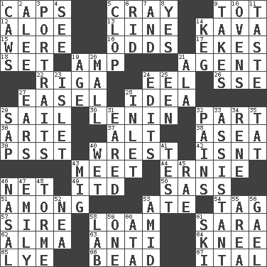 ACROSS 1. Smile enhancers 5. Supercomputer manufacturer 9. Small child 12. _ vera 13. Actor's bit 14. Polynesian shrub of the pepper family 15. We are 16. Likelihood 17. Supplements with great effort 18. Put into a specified state 19. Electrical Unit 21. Representative 22. Port city in Latvia 24. Snakelike fish 26. Compass dir. 27. Artist's stand 28. It may be bright or harebrained 29. Move on water 30. Soviet premier 1918-24 32. Component 36. Johnson of "Laugh-In" 37. The first octave above the treble staff 38. Toward the sea 39. Inconspicuous attention getter 40. Obtain by seizing forcibly or violently 42. Is not 43. Confront 44. Bert's buddy 46. Remaining after all deductions 49. It would 50. Backtalk 51. Amid 53. Had dinner 54. Label 57. Title for a man of rank and authority 58. Rich soil 61. "Two Mules for Sister ____" 62. _ mater 63. Opposed to 64. Leg joint 65. Potassium hydroxide 66. Necklace unit 67. Slanted text style (abbr.) DOWN 1. Crow sounds 2. Toward shelter 3. Likenesses of persons 4. Observe 5. Hoof sound 6. To free from 7. Added to 8. Consenting reply 9. Proceeds 10. Baking chambers 11. Clothes sense 14. Cask 19. Mature 20. Shopping center 21. In the manner of 23. Small island 24. Proofreads 25. Car or cant ending 27. Hearing organs 28. An arm off of a larger body of water 29. Plant excrement 31. Having ears or earlike features 32. Aches 33. Helper 34. French philosopher Descartes 35. Make lace 40. Soggy 41. Trial 43. Russian fighter aircraft 45. Actress Charlotte 46. Relating to the nose 47. Poet Dickinson 48. Singer Mel 52. Teachers' org. 53. Among 55. Type of rug 56. Highlander 58. Experiment locale 59. Single 60. _ moment's notice (2 wds.) 61. What Jean-Claude Killy likes to do