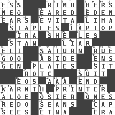 ACROSS 1. Double-curved letter 4. Tall New Zealand timber tree 8. Possessive pronoun 12. Modern: prefix 13. Having ears or earlike features 14. Paradise 15. Hearing organs 17. Webber/Rice musical 18. Pale green bean 19. Paper fasteners 21. Portable computer 23. Lyricist Gershwin 24. A female animal or person 26. French article 27. Comedian Laurel of Laurel & Hardy 28. One who doesn't tell the truth 30. Biblical high priest 31. Titan orbits this 34. Regret 37. Thick or sticky substance 38. Remain 39. Followers of ems 40. Commissioned military rank (abbr.) 41. Food holders 42. Be seated 43. College mil. group 44. Set or collection 46. Greek goddess of the dawn 47. American Automobile Association (abbr.) 50. Conclusion 51. Heat 54. Hard copy producer 57. Medicinal plant 58. Flexible twig of a willow tree 60. Singles 62. Make new 63. Seines 64. Head covering 65. Perceives with the eye 66. Inactive volcano in Sicily 67. Period DOWN 1. Compass dir. 2. Oceans 3. Determination 4. All-night dance parties 5. From or relating to Ireland 6. Was introduced to 7. Freehold land 8. Assistant 9. Proofreads 10. San ____ (Riviera town) 11. Fastener 13. Snakelike fish 16. "Two Mules for Sister ____" 20. Baking dish 22. Actor Alda or Thicke 25. Evade 27. _ gin 29. Angers 30. Ovum 31. Table seasoning 32. Phillipine bananalike plant 33. Teat (slang) 34. Dwelling 35. A single undivided whole 36. Eastern Standard Time (abbr.) 41. Mail 43. Lover boys 44. Elected rep. 45. To (old English) 46. Eat (away) 48. Bee-related 49. Sports stadium 51. Armed conflicts 52. Toward shelter 53. Stockings 55. Big collection agency 56. Posterior 59. Arrange properly for use 61. Health resort