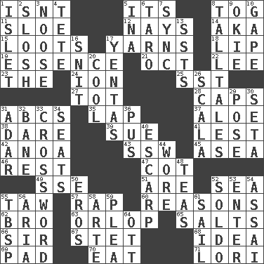 ACROSS 1. Is not 5. ___ a Wonderful Life 8. Coat; cloak 11. A type of plum 12. Negative votes 14. Alias (abbr.) 15. Plunders 17. Entertaining tales 18. Mouth edge 19. Substance 21. Sep. follower 22. Area sheltered from the wind 23. Definite Article 24. Electrically charged atom 25. Fast jet (abbr.) 27. Small child 28. Smile enhancers 31. Lettered men learn these first 35. Pet locale 37. _ vera 38. Have the gumption 39. Take to court 41. For fear that 42. Small Philippine buffalo 43. Compass dir. 45. Toward the sea 46. Relief 47. Small bed 49. Compass dir. 51. "We ___ not amused" (Victoria) 52. Ocean 55. The 23rd letter of the Hebrew alphabet 57. Hit sharply and swiftly 60. Thinks logically 62. Sis' sibling 63. Lowest deck of a ship 65. Table seasonings 66. Title for a knight 67. Proofreading order 68. It may be bright or harebrained 69. Writing tablet 70. Consume 71. Australian parrot (variant) DOWN 1. Small island 2. Agitate, as a liquid 3. Trap for birds or small mammals 4. Wig 5. _ tizzy (2 wds.) 6. Pacific island yam 7. Synchronize (abbr.) 8. Baron Munchausen's specialties 9. Migrant worker of the '30s 10. Open wide 13. Fast planes 16. In a ____ (agitated or irritated) 17. Gossips 20. Calm and collected 26. Any of the three canals of the cochlea 29. Introduce or present, as a question 30. Bristle 31. The sixth month of the Jewish calendar 32. Object of repulsion 33. What you're doing now 34. Theater features 36. Fluid product of inflammation 40. Fortification 44. Had on 48. Afternoon social gatherings 50. Greek god of love 52. Twentieth part of a lira 53. Keyboard key 54. Slender Brazilian palm 55. Cook's measure (abbr.) 56. Roberta Peters solo 58. Johnson of "Laugh-In" 59. Entreaty 61. Travel by water 64. Baseball player Mel