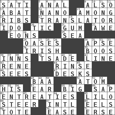 ACROSS 1. Suttee (variant) 5. Of or related to the anus 9. In addition 13. Blind as ____ 14. Billionth: prefix 15. Amid 16. Teases 17. Interpreter 19. Wedding promise 20. Nervous spasm 21. Chewing product 22. Deep reverence 23. Immeasurably long periods of time 25. Ocean 26. Fertile tracts in a desert 30. Domed church section 34. From or relating to Ireland 35. Scornful sounds 36. Taverns 39. Sadhe (variant) 42. Actor's bit 43. French philosopher Descartes 44. Remove soap 46. Perceives with the eye 47. Writing tables 48. Sound made by sheep 51. Smallest unit of an element 54. Part of HMS, perhaps 57. Ewer handle 58. Massive 60. Plant excrement 62. Pleas 65. _ and Stitch 66. Bull 67. International (abbr.) 68. Snakelike fish 69. Haul 70. Relaxation 71. Celtic language DOWN 1. Indian skirt 2. Tolerate 3. Off limits 4. ___ a Wonderful Life 5. Opposed to 6. Drug cop 7. Santa ___, CA 8. Yearns 9. Housemaid (var.) 10. Globular water bottle used in Asia 11. Overwhelm 12. Legendary monster 15. _ mater 18. Institute legal proceedings 20. Russian ruler of old 24. Annoying sounds 27. Be seated 28. Double-curved letter 29. Pottery fragment 30. Most capable 31. Luau course 32. Male offspring 33. Compass dir. 36. Big collection agency 37. Born 38. Compass dir. 40. Expire 41. Followers of ems 45. Heroin 48. Fermented drink made from hops 49. American Automobile Association (abbr.) 50. Nick name for Arthur 52. Flexible twig of a willow tree 53. Shopping centers 54. Command 55. To the inside or interior of 56. Proofreading order 58. Stakes 59. Capri or Wight 61. Airs 63. Portuguese money of account (variant) 64. _ tizzy (2 wds.) 65. Area sheltered from the wind