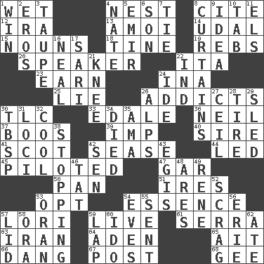 ACROSS 1. Soggy 4. A home for chicks 8. Quote 12. Retirement account (abbr.) 13. Mine, in Marseilles 14. Allodial 15. Parts of speech 18. Prong on a fork 19. Confederate soldiers (slang) 20. Orator 22. Call ___ day 23. Merit 24. _ tizzy (2 wds.) 25. Untruth 26. Inveterate users 30. Affectionate concern, for short 33. Peak District village in England 36. Famous astronaut Armstrong 37. Scornful sounds 39. Mischievous child 40. Title for a man of rank and authority 41. Highlander 42. Gospel singer Marvin 44. Directed 45. Manned the helm 47. Slender fish 50. Baking dish 51. Angers 53. Choose 54. Gist 57. Australian parrot (variant) 59. Moving, as bait 61. Spanish missionary in California 63. SW Asia republic 64. An important port of Yemen 65. Small island 66. Mild oath, euphamism for damn 67. Mail 68. Unit of force equal to gravity DOWN 1. Acquire through effort 2. Greek god of love 3. Grayish beige 4. Nathan's nickname 5. Independent ruler or chieftain 6. Male child 7. Make a knot 8. Window treatments 9. The main thing one is thinking about 10. Bar bill 11. Raised railways 16. Be tempered by heat 17. Indian skirt 21. Leg joint 22. Working for oneself (abbr.) 24. Binary compound 26. High mountains 27. To provide with a ceiling 28. Become fatigued 29. Downhill vehicle 30. Cook's measure (abbr.) 31. Venues 32. Calm and collected 34. Passed on 35. Housemaid (var.) 38. Ceasing 42. Elected rep. 43. The front part of a cuirass 46. Make lace 48. Ancient Greek god of war 49. French philosopher Descartes 52. Strangle with an iron collar 53. Northwest Algerian city 54. Nights before holidays 55. Transmitted 56. One of the Great Lakes 57. Flaplike covering 58. Mouth or opening 59. Pet locale 60. Wedding promise 62. Had dinner