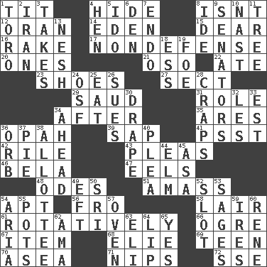 ACROSS 1. Teat (slang) 4. Flintstone garb 8. Is not 12. NW Algerian seaport 14. Locale of original sin 15. Letter starter 16. Libertine 17. Unrelated to defense, as in spending 20. Singles 21. Bear (Spanish) 22. Had dinner 23. Imelda's hoard 27. Religious group 29. Saudi Arabian king (1953-1964) 31. Hero or heavy, e.g. 34. Following 35. Ancient Greek god of war 36. Brightly colored fish 39. Plant excrement 41. Inconspicuous attention getter 42. Cause heat under the collar 43. Entreaties 46. Actor Lugosi 47. Snakelike fish 48. Lyric poems 51. Collect or gather 54. Fitting 56. Away 58. Den 61. Happening in regular succession 66. Legendary monster 67. Detail 68. Writer Wiesel 69. Adolescent 70. At sea 71. Pinches, bites 72. Compass dir. DOWN 1. "Corrida" creature 2. SW Asia republic 3. Proceeds 4. Layer 5. Wedding promise 6. Lair 7. Inside; within (prefix) 8. Binary compound 9. Elected representatives 10. Political cartoonist Thomas 11. Woody plant 13. Soft 18. Double-curved letter 19. Enemy 24. Order of Saint Francis (abbr.) 25. Ingest 26. Institutes legal proceedings 28. Dice game 30. Window treatment 32. French article 33. Eastern Standard Time (abbr.) 34. At or in the front 36. Globe 37. Sliced dessert 38. One to whom something is allotted 40. Entreaty 44. Shade tree 45. White ___ sheet 49. Newt 50. _ Lanka 52. Narrow opening 53. Gurus 54. Roberta Peters solo 55. Cooking vessels 57. Baking chamber 59. Angers 60. French philosopher Descartes 62. Nanny (var.) 63. Connecticut Ivy Leaguer 64. Mouth edge 65. It is so
