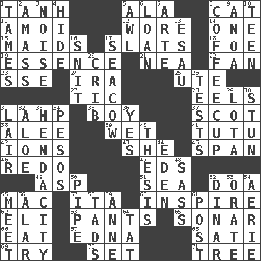ACROSS 1. Hyperbolic tangent 5. In the manner of 8. Domesticated feline 11. Mine, in Marseilles 12. Had on 14. Single 15. Women servants 17. Narrow boards 18. Enemy 19. Gist 21. Teachers' org. 22. Air blower 23. Compass dir. 24. Lyricist Gershwin 25. Shoshoni 27. Nervous spasm 28. Snakelike fish 31. Desk light 35. Male child 37. Native of Scotland 38. Toward shelter 39. Dripping 41. Ballerina skirt 42. Charged atoms 43. A female animal or person 45. Connect, as a bridge 46. Make new 47. Begley and Asner 49. Viper 51. Ocean 52. ___ good deed 55. Apple computer (short form) 57. Call ___ day 60. Motivate 62. Biblical high priest 63. Leg coverings 65. Echolocation 66. Erode 67. Pulitzer Prize-winning author Ferber 68. Suttee (variant) 69. Attempt to accomplish something 70. Arrange properly for use 71. Relationship diagram DOWN 1. Makes less strong or intense 2. Collect or gather 3. Annoying sound 4. Flintstone garb 5. Leather borer 6. Grant temporary use of 7. Johnson of "Laugh-In" 8. Java holder (2 wds.) 9. Small Philippine buffalo 10. Adolescent 13. Son of Isaac 16. In a ____ (agitated or irritated) 17. Manatee 20. Baby bed with high sides 26. Trials 29. Globular water bottle used in Asia 30. Make senseless or dizzy 31. Den 32. _ vera 33. Ananias' fault 34. Mexican monetary units 36. Affirmative reply 40. College paper 44. Locale of original sin 48. Backtalk 50. Corncob 52. Middle Eastern gold or silver currency 53. Declaim 54. Nest on high 55. Rendezvous 56. Having or resembling wings 58. Small boys 59. Queen of England 1702-14 61. Mail 64. Make lace
