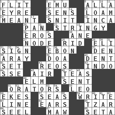 ACROSS 1. Sudden quick movement 5. Australian flightless bird 8. Silent film actress Nazimova 12. Jane of fiction 13. Elected reps. 15. Rich soil 16. Intended 18. In a ____ (agitated or irritated) 19. South American Indian 20. Baking dish 22. Slender, wiry 24. Greek god of love 26. A saturated hydrocarbon 27. Connecting point 28. To free from 29. Biblical high priest 32. Public display of a written message 35. Inky black, to poets 37. Lair 38. Like ___ of sunshine 39. ___ good deed 40. Gouge 41. Put into a specified state 42. Vintage cars 43. Southeast Asian peninsula 44. Compass dir. 45. Atmosphere 46. Beverages made from leaves 49. Shade tree 50. Emitted 51. Speakers 55. Lion 56. Supplements with great effort 57. Oceans 59. Compose 63. Actor's bit 64. Hearing organs 65. Czar 66. Stitch closed the eyes of (a falcon) 67. Opening into something insatiable 68. Stalk of a moss capsule DOWN 1. Opposite of masc. 2. Potassium hydroxide 3. Retirement account (abbr.) 4. 3-inch nail 5. Double-curved letter 6. Not women's 7. A single undivided whole 8. Place in a line 9. Protracted 10. Made of lace 11. Nanny (var.) 14. Put through a sieve 17. Edible starchy tuberous root 21. Dreamland 23. Working for oneself (abbr.) 25. Sowing specialist 28. Cooks with dry heat, as in an oven 29. Paradise 30. Grant temporary use of 31. To the inside or interior of 32. Backtalk 33. Angers 34. Yard entry 36. Oct. 31 cry 40. What propaganda does 42. Full of chinks, cracks, or crevices 45. The first octave above the treble staff 47. Snakelike fish 48. Afresh 49. Artist's stand 51. Migrant worker of the '30s 52. French philosopher Descartes 53. 480, 500 or 516 sheets of paper 54. "Two Mules for Sister ____" 56. Raised railways 58. Compass dir. 60. Ending with capital 61. Make lace 62. Epoch
