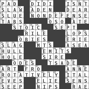 ACROSS 1. Groovy apt. 4. "You Light Up My Life" star Conn 8. Is not 12. Cole _ (cabbage dish) 14. Arabian gulf 15. Letter starter 16. Turn sharply 17. Unrelated to defense, as in spending 20. Bar bills 21. Bear (Spanish) 22. Had dinner 23. Unemotional 27. Back-to-school mo. 29. Cause heat under the collar 31. Chops off 34. Off-Broadway awards 35. 4th largest of the Great Lakes 36. Volcanic refuse 39. Mountains (abbr.) 41. Toward the sea 42. Frame or body of a ship 43. Sends forth 46. Opening into or through something 47. Father 48. Lyric poems 51. Sadhe (variant) 54. Nonscientific branch of learning 56. Back 58. Singer Murray 61. Rotating or pertaining to rotation 66. Slanted text style (abbr.) 67. Nights before holidays 68. Writer Wiesel 69. Elected reps. 70. Ooze 71. Cuts off 72. Actress Charlotte DOWN 1. Inconspicuous attention getter 2. Silent film actress Nazimova 3. Applies to a surface 4. Daniel's nick name 5. Wedding promise 6. Lair 7. Southeast Asian peninsula 8. Binary compound 9. Legislators 10. Political cartoonist Thomas 11. Relationship diagram 13. 270 degrees 18. Double-curved letter 19. Enemy 24. Globe 25. One more than two 26. Clement's nick name 28. Entreaties 30. _____ Park, CO 32. Sliced dessert 33. Ocean 34. Stared 36. Quiet! 37. Nilotic language 38. One to whom something is allotted 40. Stricken, poetically 44. Big collection agency 45. Afternoon social gathering 49. Lizard (obsolete) 50. Indian title of respect (Mr.) 52. Raised platform 53. Keyboard key 54. Ancient Greek god of war 55. Be footloose 57. Baking chamber 59. Grandmother 60. Otherwise 62. Viper 63. Connecticut Ivy Leaguer 64. Mouth edge 65. Affirmative reply