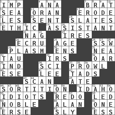 ACROSS 1. Mischievous child 4. Santa ___, CA 7. Naughty child 11. Ocean 12. NW Algerian seaport 13. Eat (away) 14. French article 15. Emitted 16. Chalkboards 17. Value system 19. Helper 21. Tired old horse 23. Angers 24. Shade of tan 25. Grow older 26. Compass dir. 29. Suffix with ecto or cyto 30. Followers of ems 31. Teachers' org. 32. The 19th letter of the Greek alphabet 33. Big collection agency 34. Boat paddle 35. Indiana (abbr.) 36. _-fi 37. Move like a hungry wolf 40. Compass dir. 41. Area sheltered from the wind 42. Small boys 43. Examine hastily 45. Had dinner 46. Casting lots 51. Potato state 55. Foolish or stupid persons 56. Redecorate 58. Directed 59. Having high moral qualities 60. Actor Alda or Thicke 61. Single 62. Celtic language 63. Cunning 64. Double-curved letter DOWN 1. Capri or Wight 2. Rendezvous 3. Romantic infatuation 4. "We ___ not amused" (Victoria) 5. Grandmother 6. Pismires 7. Naughty children 8. Round or rotation of duties 9. An important port of Yemen 10. Trial 12. Motion picture awards 13. Otherwise 16. Founders of families 18. South American Indian 20. Signals 22. Chewing product 24. Evade 25. Nest on high 26. Overwhelms 27. Lick closed 28. Armed conflict 29. Zero-star reviews 32. Neckwear 33. Ancient Celtic tribe of eastern Britain 36. Narrow boards 37. Parent Teacher Association (abbr.) 38. Food allowance for one day 39. Wrote a lyric poem 43. Took without asking 44. Quote 46. Trig term 47. Aroma 48. Teases 49. Mouths or openings 50. 1994 drama film starring Jodie Foster 52. _ vera 53. Coop moms 54. Lyric poems 57. 24 hours