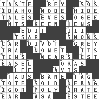 ACROSS 1. Clothes sense 6. Marina Del _, California 9. Mayday 12. Potato state 13. Method 14. Flintstone garb 15. Stories 16. Nights before holidays 17. Double curve, resembling the letter S 18. Mountains (abbr.) 19. Peachy ____! 20. Coop moms 21. Prepare for publication 23. One more than two 24. Russian ruler of old 25. Frozen precipitation (plural) 28. 4-wheeled motor vehicle 30. A piece of turf (Scot.) 34. Jennifer or Joel 35. Retirement account (abbr.) 36. Music written for nine 38. ___ a Wonderful Life 39. Canisters 41. Puts on (as clothing) 43. Eastern Standard Time (abbr.) 44. Artist's stand 46. Mouths or openings 48. Area sheltered from the wind 49. Advice 50. Small amounts or degrees 51. Object of repulsion 53. Label 56. Carryall 57. Disposed of to a purchaser 58. Debunk (Brit. slang) 60. Composer Stravinsky 61. More than one (prefix) 62. Feeling or showing extreme anger 63. Hearing organ 64. White ___ sheet 65. First name in cosmetics DOWN 1. Teat (slang) 2. First man 3. Table seasoning 4. College papers 5. Greek goddess of the dawn 6. Be footloose 7. Paradise 8. Affirmative reply 9. Seigniories (variant) 10. Lyric poems 11. Perceive with the eye 13. Confront 14. Cultivating 19. Japanese brewing company 20. Part of HMS, perhaps 22. June honoree 24. Interpreter 26. Soaks 27. System (abbr.) 28. Quote 29. Operatic vocal solo 31. Promise 32. Single 33. Beverage made from leaves 37. Collection of objects 40. Sowing specialist 42. Indian title of respect (Mr.) 45. French article 47. Michaelmas daisies 49. Actor Griffith 50. Ancient Roman robe 51. Expressions of contempt or scorn 52. Silent film actress Nazimova 54. Blind as ____ 55. Yard entry 56. Neckwear 57. Health resort 58. Pass on 59. Unit of force equal to gravity