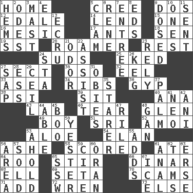 ACROSS 1. Dwelling 5. Algonquian 9. Two (Sp.) 12. Peak District village in England 14. Grant temporary use of 15. Single 16. Mesonic 17. Pismires 18. Elected rep. 19. Fast jet (abbr.) 20. Nomad 23. Respite 24. Soap bubbles 25. Supplemented with great effort 27. Religious group 30. Bear (Spanish) 32. Snakelike fish 33. At sea 34. Teases 36. Hustle 38. Air pressure measure (abbr.) 39. Be seated 40. Santa ___, CA 43. Experiment locale 46. Rend 48. Small, secluded valley 49. Male child 51. _ Lanka 52. Mine, in Marseilles 53. _ vera 54. Enthusiasm 56. American tennis player Robert 58. Tallied 61. Had dinner 64. Friend of Pooh 65. Use a spoon 66. Middle Eastern gold or silver currency 68. Pipe bend 69. Bristle 70. Fraudulent business schemes 71. Say or write further 72. Songbird 73. Otherwise DOWN 1. Folds over and sews together 2. Lyric poems 3. Vertical spar for supporting sails 4. Biblical high priest 5. Dollar (slang) 6. French philosopher Descartes 7. Main course 8. Begley and Asner 9. Administered medicine 10. Singles 11. Transmitted 13. Shade of tan 21. Scent 22. Aid 23. Have confidence or faith in 24. R.R. building 26. Barrel 27. Plant excrement 28. Curvy letter 29. To provide with a ceiling 31. Off-Broadway awards 35. A viewer who gazes fixedly 37. Inside of hand 41. Modern: prefix 42. Cuckoo 44. Competent 45. Oct. 31 cry 47. Cause heat under the collar 48. Separate the seeds from cotton 50. Of or pertaining to yesterday 53. Hold, grip (Informal) 55. Sums up 56. Type of rug 57. Disposed of to a purchaser 59. Quote 60. NW Algerian seaport 61. Of or related to the anus 62. Scottish caps 63. Celtic language 65. Compass dir. 67. Frozen water