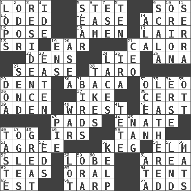 ACROSS 1. Australian parrot (variant) 5. Proofreading order 9. Distress signal 12. Wrote a lyric poem 13. Relaxation 14. Land measure 15. Airs 16. So be it 17. Den 18. Indian title of respect (Mr.) 19. Hearing organ 21. Bodily heat indicating an inflammation 22. Hiding places for outlaws 24. Whopper 26. Santa ___, CA 27. Gospel singer Marvin 28. Pacific island yam 29. Undesirable depression on a surface 30. Phillipine bananalike plant 32. Margarine 36. At one time in the past 37. Mamie's husband 38. Foregone conclusion 39. Arabian gulf 40. Obtain by seizing forcibly or violently 42. Compass direction 43. Writing tablets 44. Related on the mother's side 46. Coat; cloak 49. Big collection agency 50. Hyperbolic tangent 51. Match 53. Barrel 54. Shade tree 57. Downhill vehicle 58. Ear part 61. Length times width 62. Afternoon social gatherings 63. Taken by mouth 64. Portable shelter 65. Eastern Standard Time (abbr.) 66. Canvas cover 67. Does sums DOWN 1. Chops off 2. Aroma 3. Home 4. Binary compound 5. Shrivel 6. Scottish cap 7. Compass dir. 8. "___ Little Indians" 9. Any of the three canals of the cochlea 10. Constellation of myth 11. Father Junipero _ 14. In the manner of 19. Followers of ems 20. Toward the sea 21. Corporate head (abbr.) 23. Ingested 24. Shoestrings 25. Retirement account (abbr.) 27. Transmit 28. Proceeds 29. ___ good deed 31. Avian creatures 32. Sea 33. Tough but pliablecoriaceous 34. Celtic language 35. Baseball player Mel 40. Armed conflict 41. False hair 43. Sliced dessert 45. Tired old horse 46. Clothes sense 47. Stares at amorously 48. Relatively large 52. Begley and Asner 53. Seaweed 55. Grant temporary use of 56. Floor protectors 58. Car dealer's back yard 59. Mouth or opening 60. Soap unit 61. _ moment's notice (2 wds.)