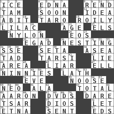 ACROSS 1. Frozen water 4. Pulitzer Prize-winning author Ferber 8. Tear apart 12. Scottish cap 13. Within a short period 14. It may be bright or harebrained 15. "This won't hurt ____!" 17. Edible starchy tuberous root 18. Agitated, as a liquid 19. Pale purple color 21. Grow older 23. Raised railways 24. Thermoplastic polyamide 26. Greek goddess of the dawn 28. Mild oath 30. Snuggling 34. Compass dir. 37. Bristle 39. Toward the sea 40. Bit 41. Tarsus (plural) 43. Whopper 44. Type of rug 46. One who doesn't tell the truth 47. Pipe bend 48. Simpletons 51. Thin strip of wood or metal 54. First lady 55. Trap for birds or small mammals 58. Modern: prefix 61. Chicken ___ king 63. Add up to 65. Composer Copland 67. Movie discs 71. Have the gumption 72. Russian ruler of old 73. "Vaya con ____" 74. Allow 75. Inactive volcano in Sicily 76. Emitted 77. Begley and Asner DOWN 1. Slanted text style (abbr.) 2. Small house or cottage 3. Poet Dickinson 4. Eastern Standard Time (abbr.) 5. ___ good deed 6. And not 7. Small Philippine buffalo 8. _ de Janeiro 9. Singer Brickell 10. 1994 drama film starring Jodie Foster 11. 24-hour periods 16. Falsehood 18. Vintage cars 20. Gear tooth 22. Unit of force equal to gravity 25. Political cartoonist Thomas 27. R.R. building 29. Allots cards 30. Rhinal 31. Small island 32. Famous astronaut Armstrong 33. Highlander 34. Comedian Laurel of Laurel & Hardy 35. Indian skirt 36. Paradise 38. Three (prefix) 42. SW Asia republic 45. A saturated hydrocarbon 49. _ the terrible 50. Snakelike fish 52. Small child 53. Parka part 56. Having lost freshness 57. Having ears or earlike features 58. Nathan's nickname 59. 90 degrees 60. Northwest Algerian city 62. Does sums 64. Allows 66. Mouth or opening 68. Compete 69. Spanish title 70. Fast jet (abbr.)