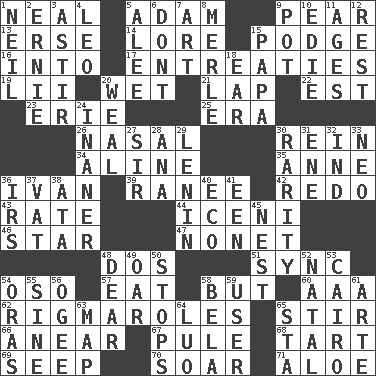 ACROSS 1. Be tempered by heat 5. First man 9. Lightbulb-shaped fruit 13. Celtic language 14. Old wives' tales, e.g. 15. Puddle 16. To the inside or interior of 17. Pleas 19. Cards in a Roman deck? 20. Dripping 21. Infant locale 22. Eastern Standard Time (abbr.) 23. 4th largest of the Great Lakes 25. Period 26. Rhinal 30. It's straight from the horse's mouth 34. Place in a line 35. Queen of England 1702-14 36. "Terrible" tsar 39. Indian princess (variant) 42. Do over again 43. Assign a rank or rating to 44. Ancient Celtic tribe of eastern Britain 46. Play the lead 47. Music written for nine 48. Two (Sp.) 51. Synchronize (abbr.) 54. Bear (Spanish) 57. Erode 58. With the exception that 60. Auto club (abbr.) 62. Frustrating wastes of time 65. Use a spoon 66. Approach 67. Whimper 68. Small pie 69. Ooze 70. Fly high 71. Medicinal plant DOWN 1. Famous astronaut Armstrong 2. Bert's buddy 3. Moving about 4. Lion 5. Toward shelter 6. Do not 7. Tate display 8. Haggard of country music 9. Cooking vessel 10. Singer Brickell 11. Matures 12. Repose 15. Dad 18. Ewer handle 20. Welt 24. More lacking in sense or substance 27. Title for a knight 28. Santa ___, CA 29. Soviet premier 1918-24 30. Noteworthy scarcity 31. Compass dir. 32. Working for oneself (abbr.) 33. Modern: prefix 36. Big collection agency 37. Large container 38. "One Day ___ Time" 40. Environmental prefix 41. Car or cant ending 45. A home for chicks 48. Letter starter 49. Rowing implement 50. Closes up, plugs up 52. Brizilian seaport 53. Capital of Egypt 54. Mouths or openings 55. Trig term 56. Double curve, resembling the letter S 58. Actor Lugosi 59. One who makes use of a thing 61. Johnson of "Laugh-In" 63. Atlas unit 64. Nilotic language 65. R.R. building