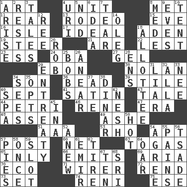 ACROSS 1. Tate display 4. A single undivided whole 8. Was introduced to 11. Bring up, as a child 13. Cowboy competition 15. Night before a holiday 16. Capri or Wight 17. Perfect 18. An important port of Yemen 19. Bull 21. "We ___ not amused" (Victoria) 22. For fear that 23. Curvy letter 24. Chief or king in Benin or Nigeria 27. Set 29. Inky black, to poets 30. Pitcher Ryan 34. Male offspring 36. Necklace unit 39. Vertical member of a panel or frame 40. Back-to-school mo. 41. Smooth fabric 43. Lie 44. _ dish (used to culture cells) 46. French philosopher Descartes 47. Epoch 48. NE Netherlands city 49. American tennis player Robert 51. American Automobile Association (abbr.) 53. 17th letter of the Greek alphabet 54. Fitting 57. Mail 60. Remaining after all deductions 63. Ancient Roman robes 65. Inwardly 66. Gives off 69. Operatic vocal solo 70. Environmental prefix 71. One who wires 72. Tear apart 73. Arrange properly for use 74. Painter Guido (1575-1642) 75. Compass dir. DOWN 1. Ascend 2. Musical pauses 3. Falsehoods 4. RI univ. 5. Allow head to fall sleepily 6. The content of cognition 7. Pull into pieces 8. Ancient Persian 9. Nights before holidays 10. Portable shelter 12. Portuguese money of account (variant) 14. Cassini of fashion 18. One to whom something is allotted 20. Director Reiner 25. Moves up and down 26. Approach 28. Followers of ems 29. Plea 31. One who doesn't tell the truth 32. Silent film actress Nazimova 33. Born 34. Perceives with the eye 35. Elects 37. Had dinner 38. Middle Eastern gold or silver currency 40. Health resort 42. Delicate 45. _ tizzy (2 wds.) 50. Being at a high temperature 52. Afresh 54. Match 55. Aches 56. Sadhe (variant) 57. Sliced desserts 58. Single time 59. Position in a hierarchy or organization 61. Arab leader 62. Become fatigued 64. Rowing implement 67. "___ Little Indians" 68. _ Lanka