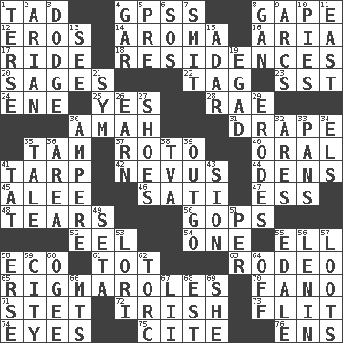 ACROSS 1. Bit 4. Global Positioning Systems (abbr.) 8. Stare wonderingly 12. Greek god of love 14. Scent 16. Operatic vocal solo 17. Travel on an animal 18. Homes 20. Gurus 22. Label 23. Fast jet (abbr.) 24. Compass dir. 25. It is so 28. Actress Charlotte 30. Nanny 31. Window treatment 35. Scottish cap 37. Printing process, for short 40. Taken by mouth 41. Canvas cover 42. Congenital growth or mark on the skin 44. Cub Scout units 45. Toward shelter 46. Suttee (variant) 47. Curvy letter 48. Lacerates 50. Republicans 52. Snakelike fish 54. Single 55. Pipe bend 58. Environmental prefix 61. Small child 63. Cowboy competition 65. Frustrating wastes of time 70. Papal veil 71. Proofreading order 72. From or relating to Ireland 73. Sudden quick movement 74. Sight organs 75. Quote 76. Followers of ems DOWN 1. Laconic 2. Believer in; advocate of (suffix) 3. Evade 4. Slender fish 5. Before (prefix) 6. Mayday 7. Stricken, poetically 8. Separate the seeds from cotton 9. Arches 10. Sliced desserts 11. 90 degrees 13. Observe 15. The sixth month of the Jewish calendar 19. Mild oath 21. Symbol (abbr.) 26. Merit 27. Imelda's hoard 29. Eats (away) 30. Electrical Unit 32. Ancient Greek god of war 33. Zero-star reviews 34. Raised railways 35. Lie 36. Type of rug 38. Federal power corp. 39. Expenditure 41. Make lace 43. The Jewish people; Israel 49. Bristle 51. For each 53. Australian parrot (variant) 55. Peak District village in England 56. Soviet premier 1918-24 57. Plunders 58. Celtic language 59. Municipality 60. Double curve, resembling the letter S 62. Torque (variant) 64. Below a satisfactory level 66. Mountains (abbr.) 67. Cards in a Roman deck? 68. Eastern Standard Time (abbr.) 69. A female animal or person
