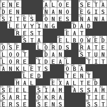 ACROSS 1. Compass dir. 4. _ vera 8. Stalk of a moss capsule 12. Lair 13. Billionth: prefix 14. Armor plate that protects the chest 15. Settings 18. Singles 19. Grandmother 20. Imposing or collecting, as a tax 22. Male parent 23. Remainder 24. Erode 25. R.R. building 26. Shoved, as through a crowd 30. Order of Saint Francis (abbr.) 33. Nobles 36. Pace 37. Plunder 39. One of the 12 tribes of Israel 40. Surprise greatly 41. Old wives' tales, e.g. 42. Standard of perfection 44. Teat (slang) 45. Short socks 47. Chief or king in Benin or Nigeria 50. Directed 51. Portable shelter 53. Actor Linden 54. Glorified 57. Stitch closed the eyes of (a falcon) 59. Thailand, formerly 61. Indian state 63. Indian skirt 64. Gumbo ingredient 65. Standoff 66. Celtic language 67. Elected reps. 68. Fast jet (abbr.) DOWN 1. Begley and Asner 2. Famous astronaut Armstrong 3. Keyboard key 4. Soon (poet.) 5. Long (Scottish) 6. Single 7. Greek goddess of the dawn 8. Legislators 9. Mild oath 10. Shallow baking pan 11. White ___ sheet 16. Nights before holidays 17. System (abbr.) 21. Slanted text style (abbr.) 22. Apply (a substance) by light strokes 24. Raised railways 26. Pulitzer Prize-winning author Ferber 27. Electrical Unit 28. Needle case 29. Undesirable depression on a surface 30. Rounded earthenware pot or jar 31. Within a short period 32. Tined utensil 34. Likelihood 35. Actress Charlotte 38. Copy Pinocchio 42. It would 43. Globular water bottle used in Asia 46. Snakelike fish 48. Actor Lugosi 49. Pismires 52. Trials 53. Possessive pronoun 54. Merit 55. Dec. holiday 56. Raised platform 57. Compass dir. 58. Hearing organ 59. Mayday 60. Eisenhower's nickname 62. Was introduced to