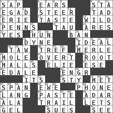 ACROSS 1. Plant excrement 4. Hearing organs 8. R.R. building 11. Mild oath 13. Bull 15. Bit 16. 4th largest of the Great Lakes 17. Clothes sense 18. Uncontrolled 19. Actor Sean's family 21. The 19th letter of the Greek alphabet 22. Ancient Greek god of war 23. It is so 24. Attila the _ 27. Prohibit 29. Centimeter-gram-second unit of force 30. Standard of perfection 34. The 23rd letter of the Hebrew alphabet 36. Not kosher 39. Haggard of country music 40. Undercover agent 41. Unconcealed 43. Carrot, for example 44. Promenades 46. Writer Wiesel 47. Compass dir. 48. Peak District village in England 49. Engineer (abbr.) 51. ___ a Wonderful Life 53. Filthy place 54. Was introduced to 57. Connect, as a bridge 60. She-sheep 63. Give a jingle 65. Long (Scottish) 66. Thick mixture 69. The sixth month of the Jewish calendar 70. Chicken ___ king 71. Drop behind 72. Allows 73. Set 74. Institutes legal proceedings 75. Perceive with the eye DOWN 1. Oozy 2. Match 3. Aches 4. Eastern Standard Time (abbr.) 5. _ moment's notice (2 wds.) 6. Respite 7. Bristle 8. Use a swizzle stick 9. Lie 10. Sums up 12. Lair 14. Reuben's nickname 18. Roamer 20. Like a shrinking violet 25. To (old English) 26. Boldness 28. Direct toward a target or goal 29. Home 31. Greek god of love 32. Medicinal plant 33. Allow 34. Frog relative 35. Silent film actress Nazimova 37. Snakelike fish 38. Strips of potato fried in deep fat 40. Madame (abbr.) 42. Portable shelter 45. Arrange properly for use 50. Swindle 52. Back-to-school mo. 54. Methods 55. Related on the mother's side 56. Laconic 57. Volcanic refuse 58. Diluted with white 59. Of or related to the anus 61. Armed conflicts 62. Son of Isaac 64. Actor Linden 67. Standoff 68. Raised railways
