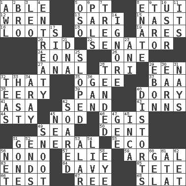 ACROSS 1. Competent 5. Choose 8. Needle case 12. Songbird 13. Indian skirt 15. Political cartoonist Thomas 16. Plunders 18. Cassini of fashion 19. Ancient Greek god of war 20. To free from 22. Elected representative 24. Immeasurably long periods of time 26. Single 27. Of or related to the anus 28. Three (prefix) 29. Car or cant ending 32. Not this but _ 35. Double curve, resembling the letter S 37. Sound made by sheep 38. Suggestive of the supernatural 39. Baking dish 40. Small, narrow, flatbottom fishing boat 41. White ___ sheet 42. Post 43. Lodging establishments 44. Filthy place 45. Dreamland 46. Armor plate that protects the chest 49. Ocean 50. Gouge 51. Commissioned military rank 55. Environmental prefix 56. Words to Nanette 57. Writer Wiesel 59. Therefore, facetiously 63. Inside; within (prefix) 64. American folk hero Crockett 65. Wig 66. Trial 67. To separate or throw off 68. Narrow board DOWN 1. Leather borer 2. Sis' sibling 3. Lion 4. Plea 5. Bear (Spanish) 6. Friends 7. Woody plant 8. Maternal 9. Pacific island yam 10. One who uses or employs something 11. ___ a Wonderful Life 14. Refuse to acknowledge 17. The Jewish people; Israel 21. Heredity factor (abbr.) 23. Cuckoo 25. Had an oblique or slanted direction 28. Looked after 29. Inky black, to poets 30. Merit 31. Negative votes 32. Beverages made from leaves 33. Command 34. Like ___ of sunshine 36. Separate the seeds from cotton 40. What propaganda does 42. Flew 45. Born 47. Turn to the right 48. South American Indian 49. Snout, nose 51. Went 52. Conclusions 53. Having or resembling wings 54. Moving, as bait 56. Remaining after all deductions 58. Sight organ 60. Set 61. "One Day ___ Time" 62. Allow
